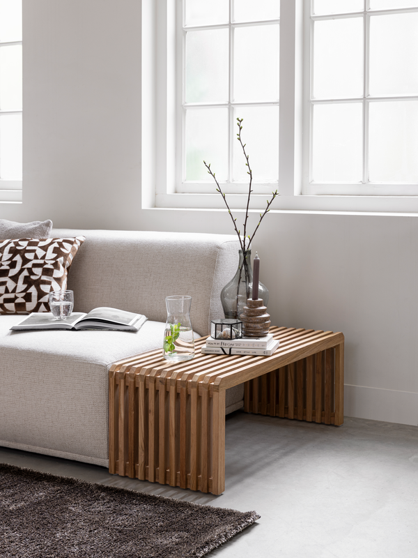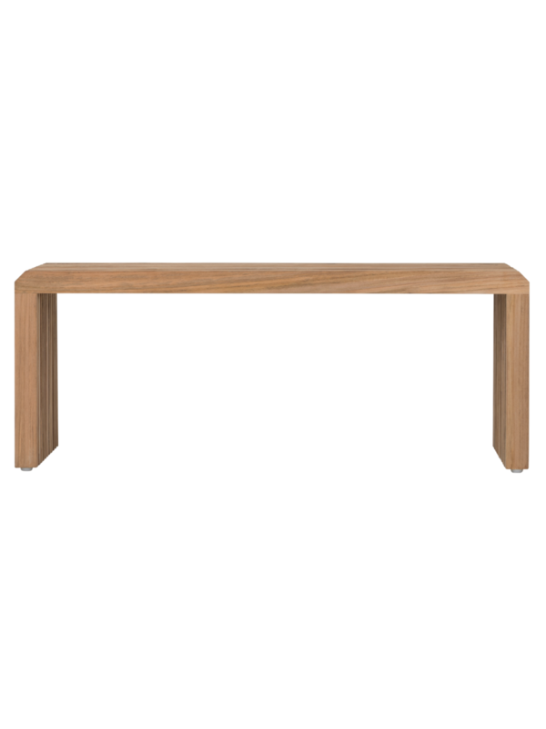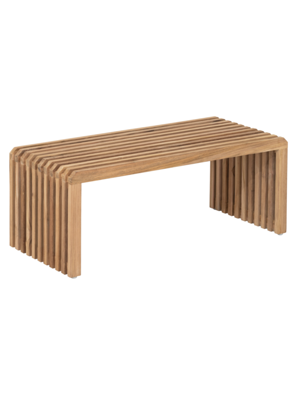 Banktafel Steve is praktisch, stijlvol en multifunctioneel. De tafel is gemaakt van geborsteld teakhout en verkrijgbaar in 90 en 100 cm. Het speelse ontwerp met latjes geeft de tafel een luchtige en eigentijdse uitstraling, waardoor hij moeiteloos in ieder interieur past.