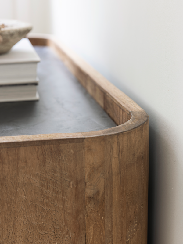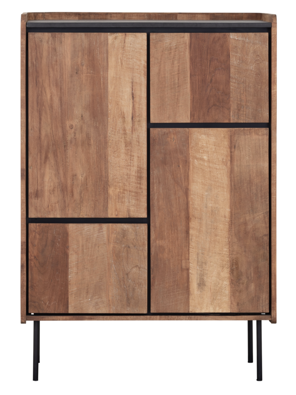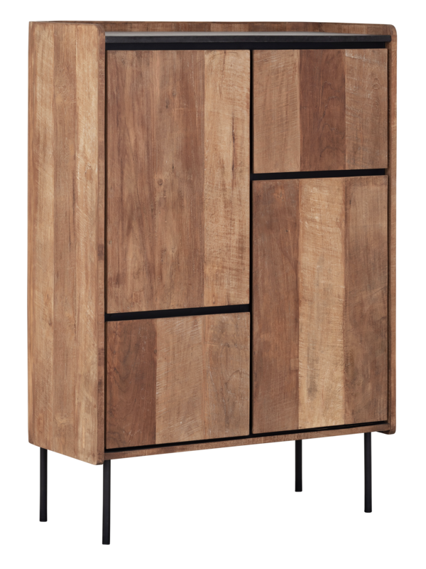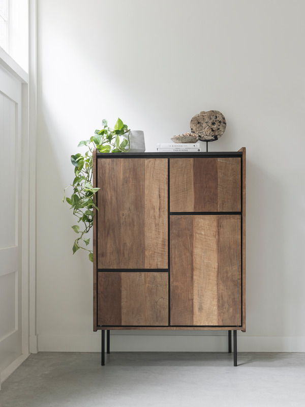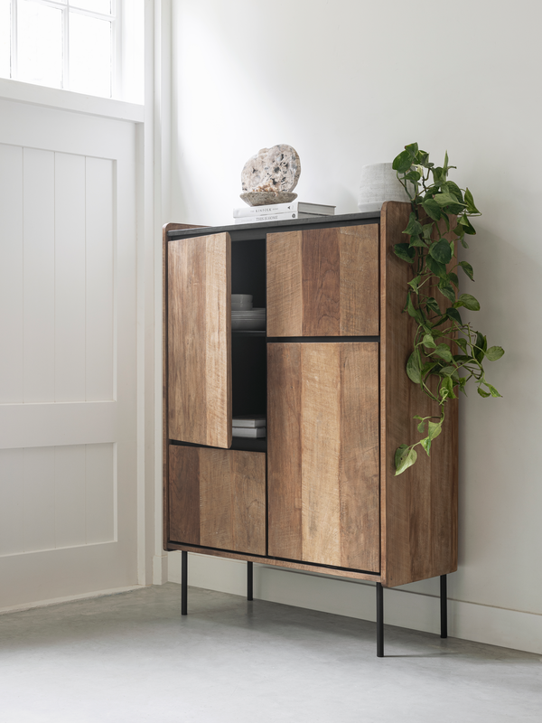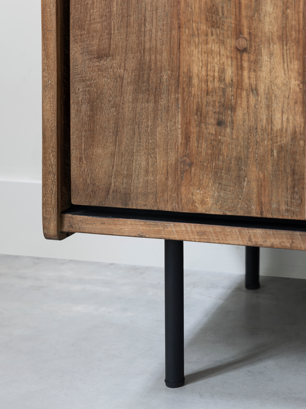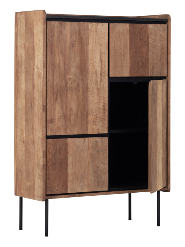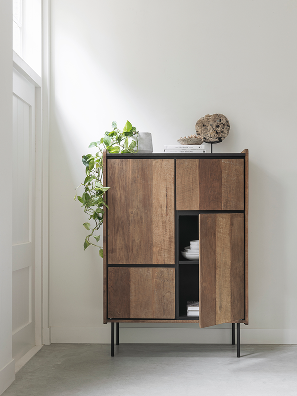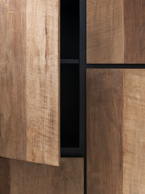 Bergkast Edge heeft een unieke uitstraling doordat de deuren van de kast een bijzondere asymmetrie hebben. Het speelse ontwerp zorgt samen met het gerecyclede teakhout en mortex voor contrast, maar worden weer verbonden door de zwarte accenten in het meubel.