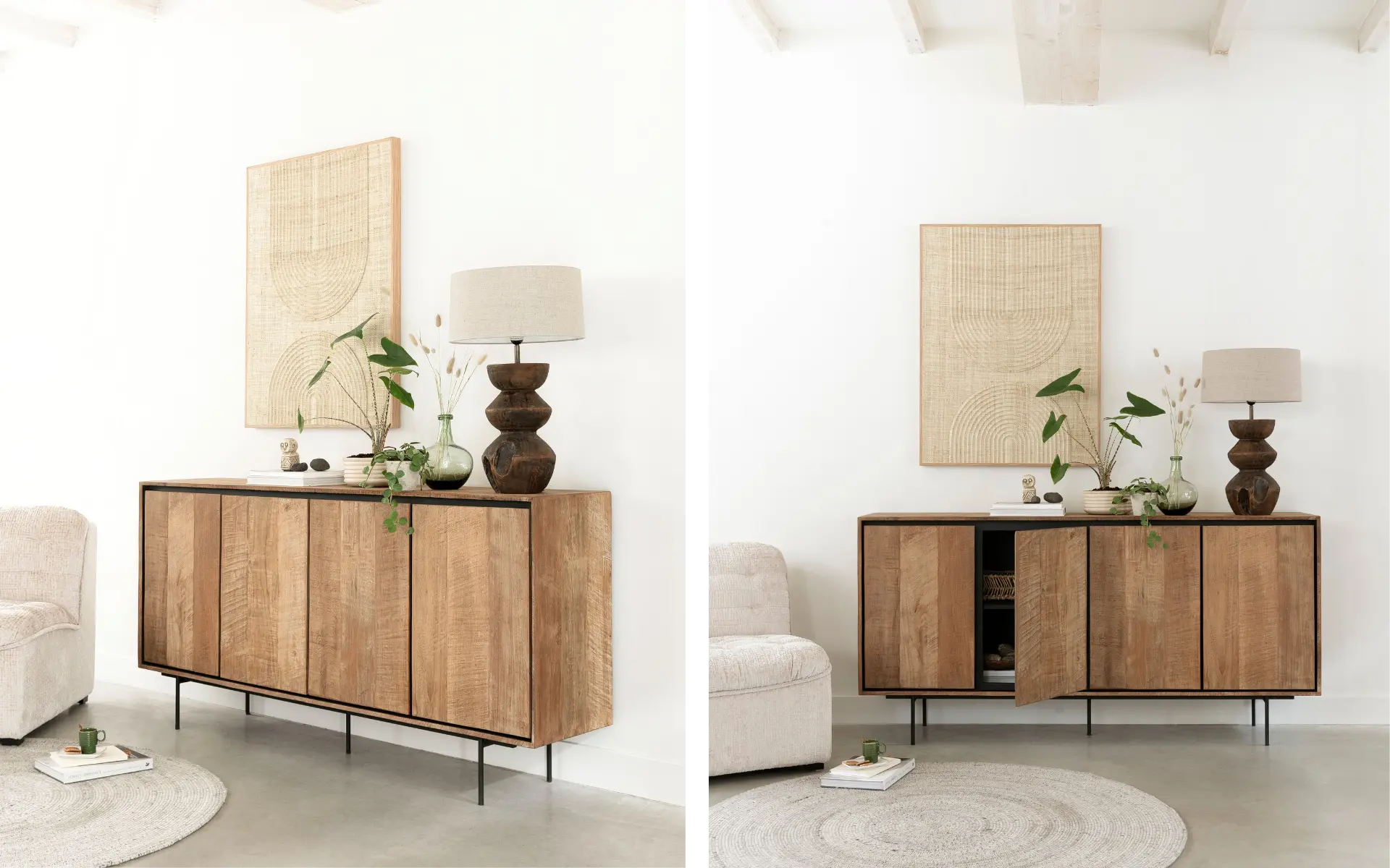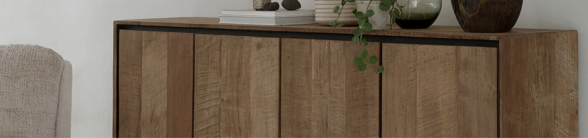 Omdat teakhout van zichzelf vol zit met karakter, heeft het niet veel nodig om te stralen in huis. Kies daarom voor rustige woonaccessoires om jouw meubel van teak mee af te maken. Neem bijvoorbeeld een mooi, natuurlijk wandpaneel boven een teakhouten dressoir voor een zachte, elegante aanvulling op het meubel. Daarnaast kan je ook gaan voor een organische vaas in een aardse tint of een tropische plant met grote, groene bladeren om in de tropische sferen te blijven. Het fijne van teakhout is dat het enorm veelzijdig is en je het overal mee kan combineren.