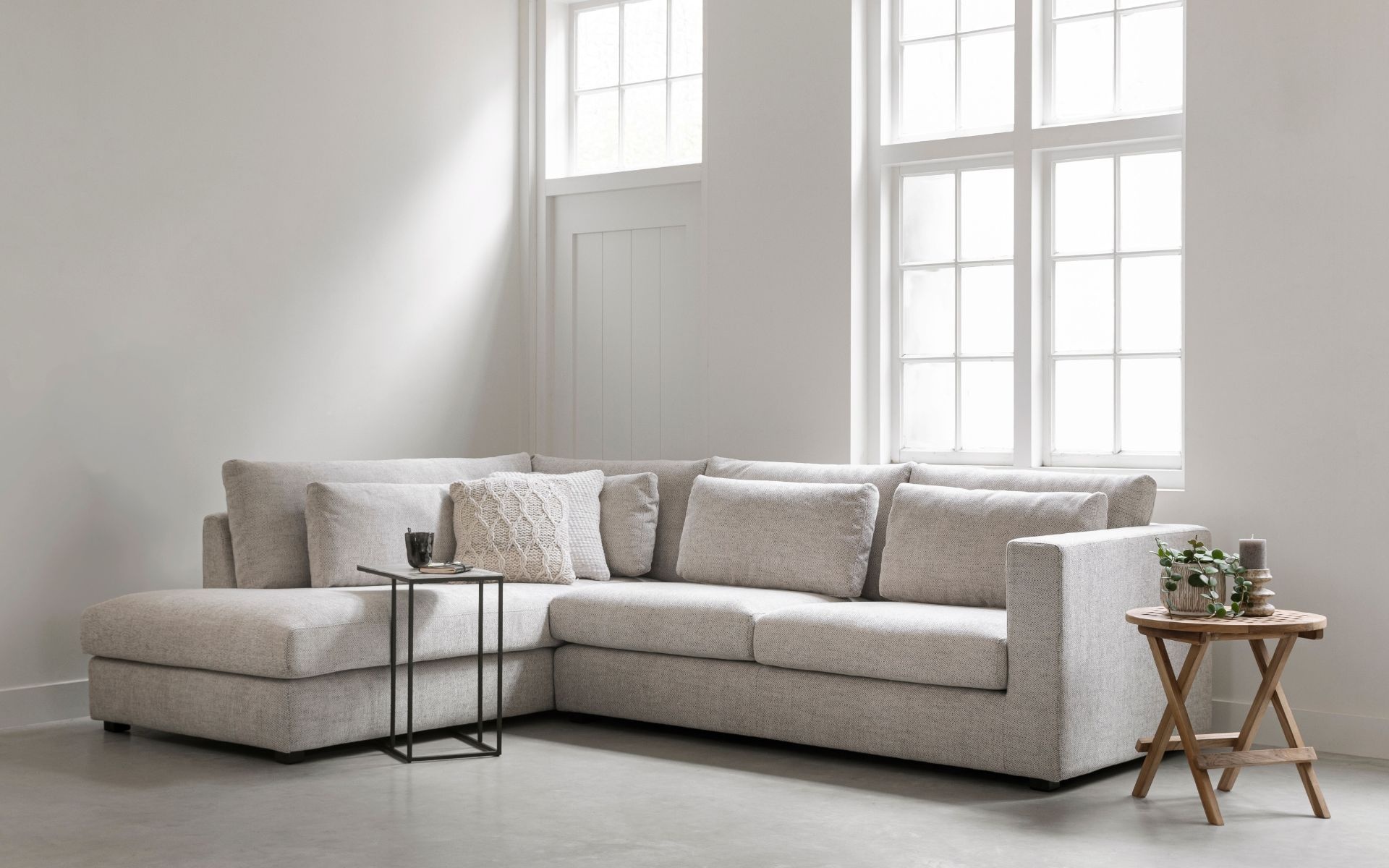 Hoekbank Martino is te verkrijgen in een vaste opstelling, hier kan je dus niet kiezen voor andere opstellingen of stoffen. Wél kan de bank links- of rechtsom, zodat hij altijd aansluit bij jouw woonruimte. De bank is licht beige van kleur en heeft een zachte, comfortabele stof met een subtiele structuur. Martino heeft een medium stevige zitting en zachte, losse kussens. De prijs van hoekbank Martino is €1299,-.