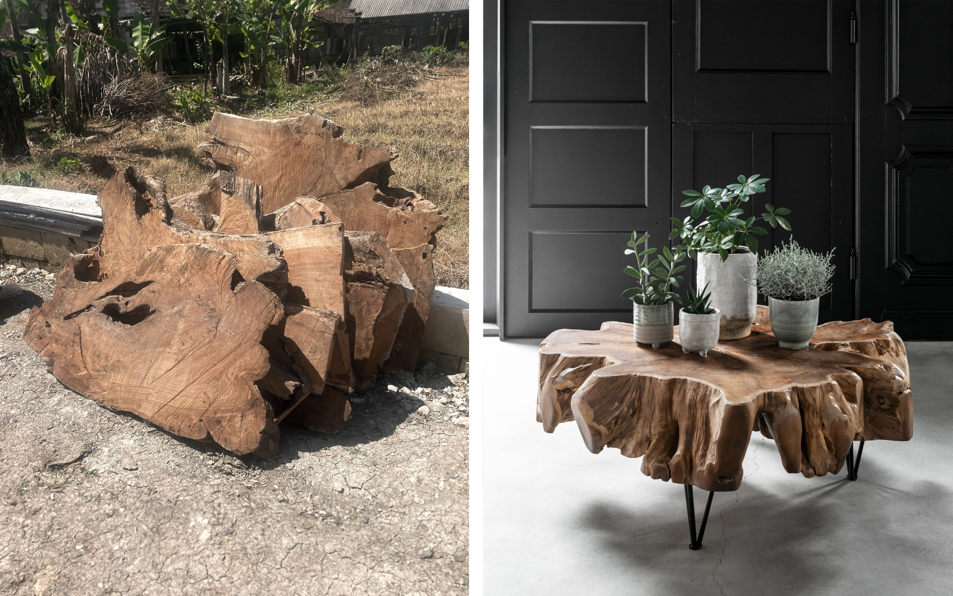 Bij het oogsten van teakbomen, blijven de wortels vaak als restproduct achter. Ze worden verzameld, schoongemaakt en gedroogd in natuurlijk zonlicht. Zodra ze gedroogd zijn, worden ze op maat gezaagd en gevormd tot het gewenste model van het meubel. Daarna worden ze geschuurd en krijgen ze een laag lak of olie ter bescherming van vocht en vlekken, maar ook om de ware kleur van het hout naar voren te laten komen. Afhankelijk van het design, worden er onderdelen als poten of een tafelblad aan gemonteerd. In dit proces wordt er zo min mogelijk bewerkt, waardoor de wortels in hun eigen kracht blijven staan en het meubel zo natuurlijk mogelijk blijft. Echt een unieke eyecatcher voor in huis dus!
