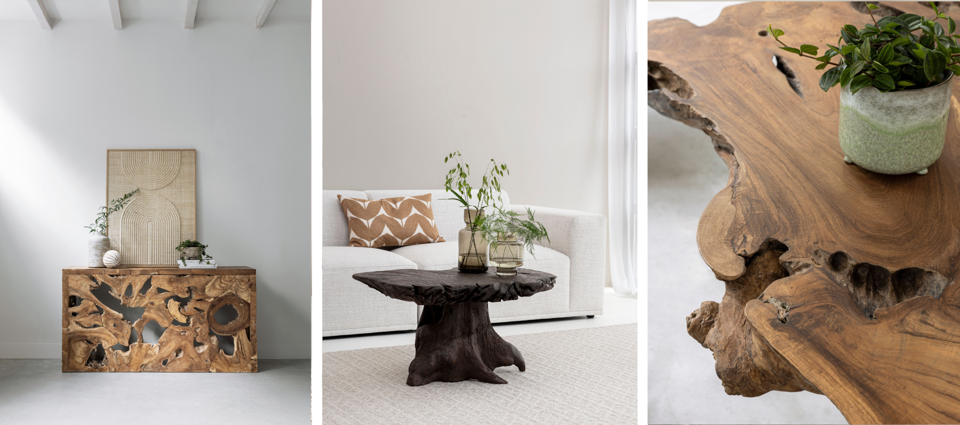 Je vindt meubels van teakwortel mooi, maar je vraagt je af of het past bij jouw woonstijl. Begrijpelijk, want het zijn opvallende stukken die soms lastig te combineren lijken. Toch is teak verrassend veelzijdig. Deze houtsoort komt vaak voor in bohemian interieurs, dankzij de warme, natuurlijke uitstraling. Maar ook in Scandinavische of modern-landelijke woningen kan teakwortel prima tot zijn recht komen. Met de juiste styling past teakwortel moeiteloos in verschillende interieurs. Hier een paar tips om het mooi te verwerken in jouw stijl: