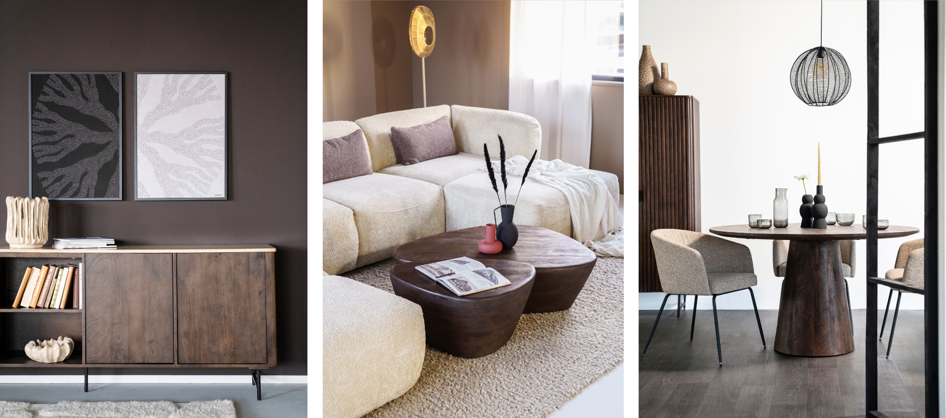 Mangohout doet het bijzonder goed als centraal punt in de eetkamer. Een mangohouten eettafel bijvoorbeeld, vormt het perfecte middelpunt van een gezellige eetkamer. In combinatie met zachte stoffen zoals linnen gordijnen, een wollen vloerkleed of fluwelen stoelen ontstaat er een mooi contrast dat zowel stoer als elegant oogt. Ook in de woonkamer komt mangohout goed tot zijn recht, bijvoorbeeld in een tv-meubel of salontafel. Voor wie liever klein begint, zijn er ook accessoires van mangohout zoals wandplanken, snijplanken of bijzettafeltjes. Zelfs met een klein accent breng je al warmte en karakter in huis.