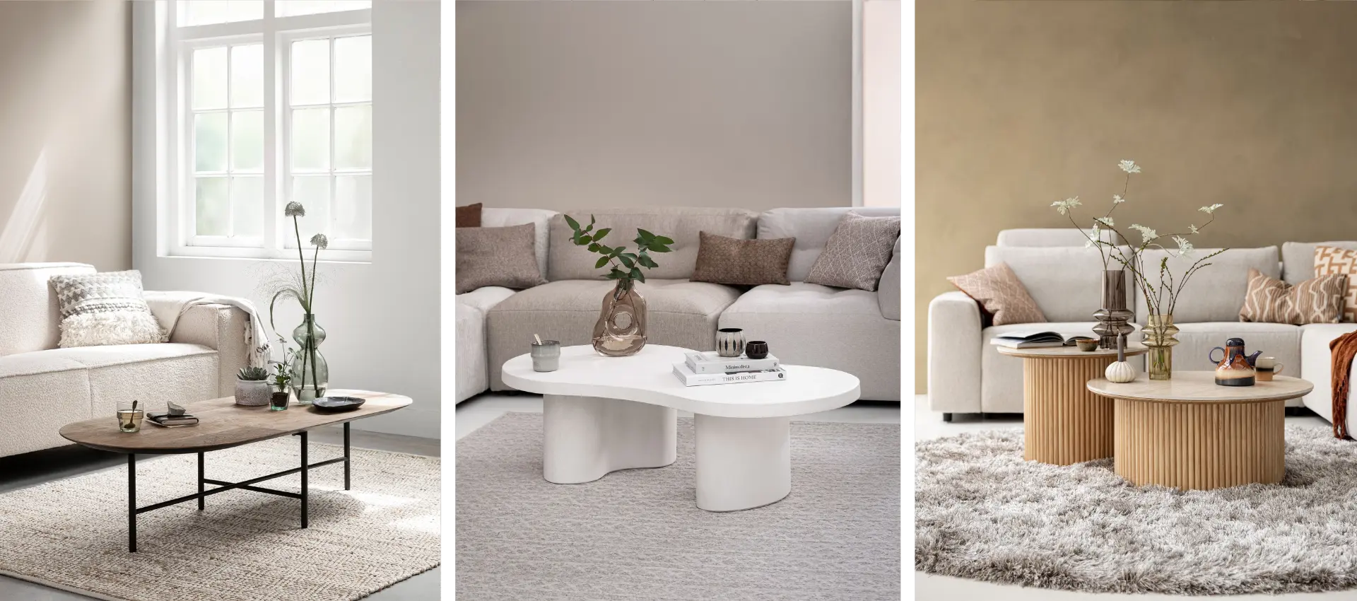 Een interieur met veel rechte lijnen, zoals een strakke bank of een rechthoekig vloerkleed, krijgt meer zachtheid met een ronde of ovale salontafel.