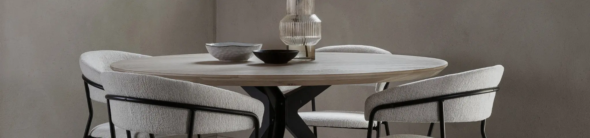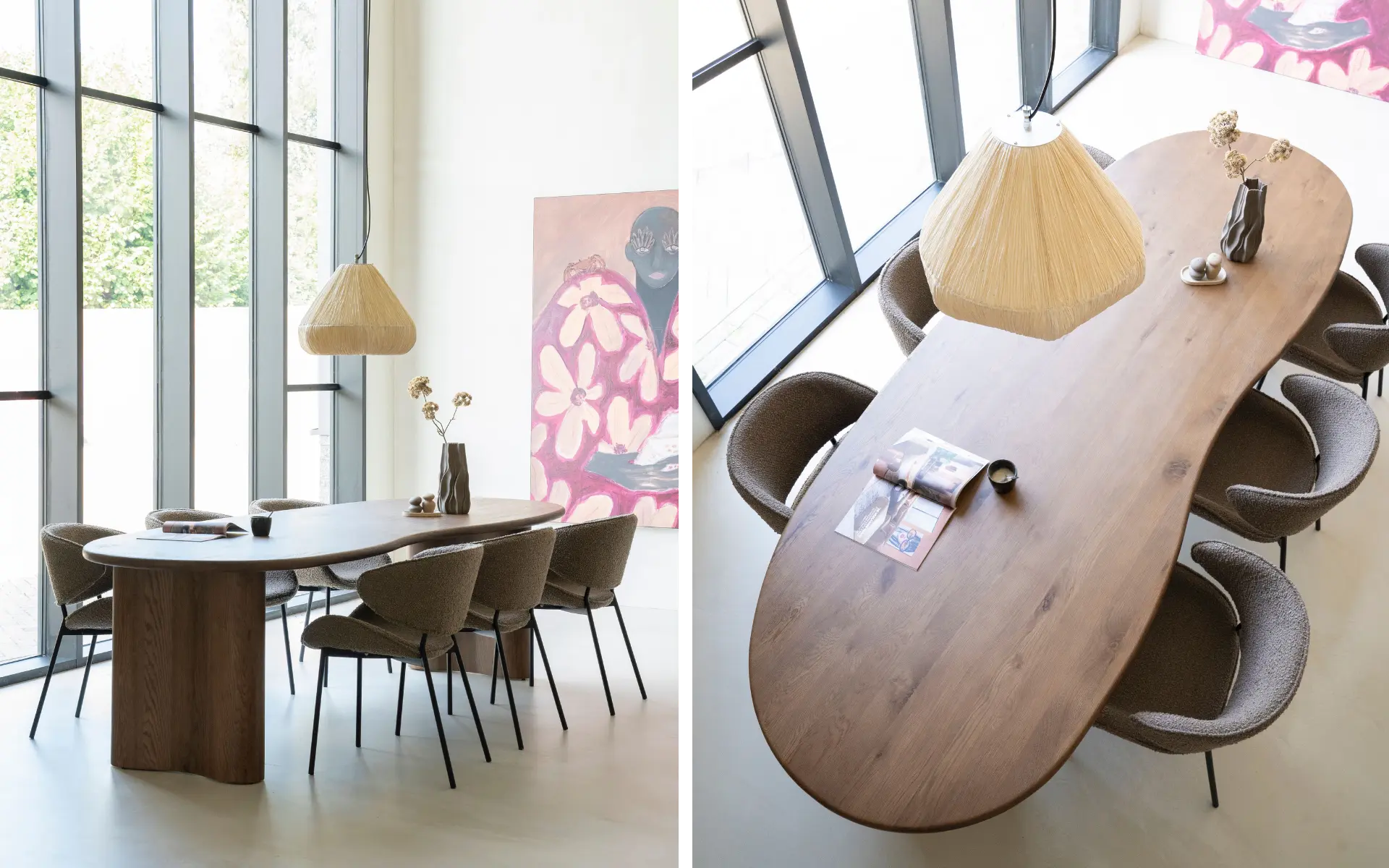 Ovale en organische tafels zijn echte sfeermakers en verrassend praktisch. Doordat ze geen scherpe hoeken hebben, kun je vaak net iets meer stoelen kwijt dan je denkt: