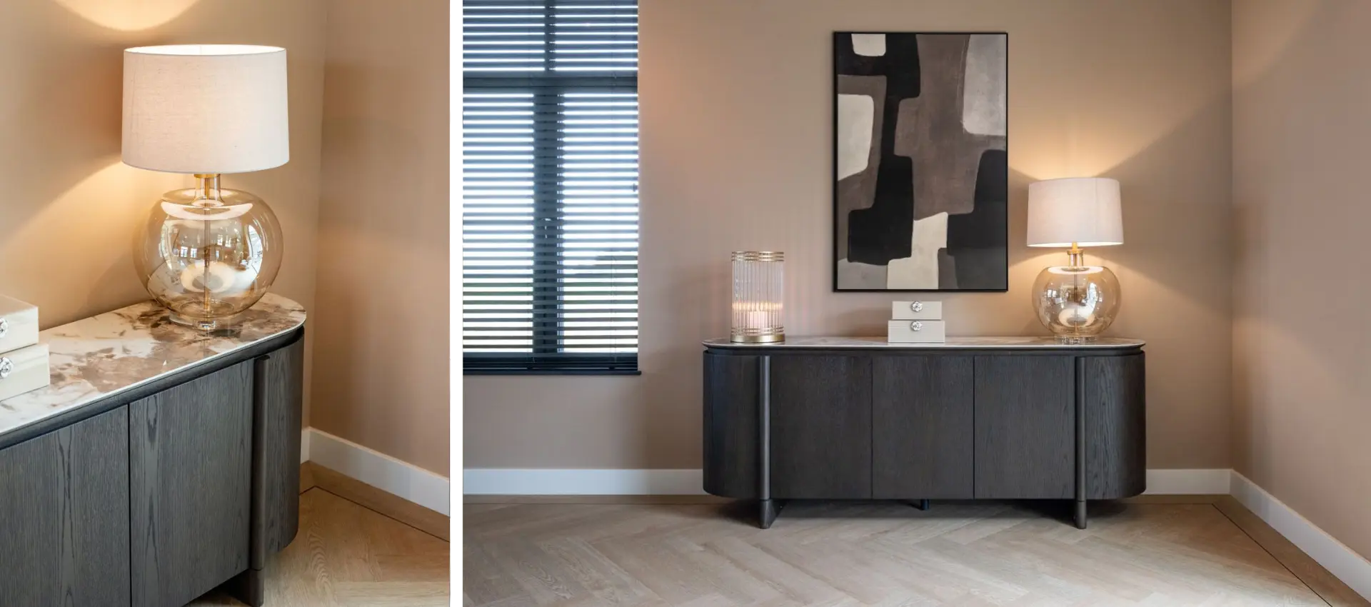 - Hout: Hout met een gladde, donkere finish vormt een mooie, rustige basis voor een modern, maar chique interieur.