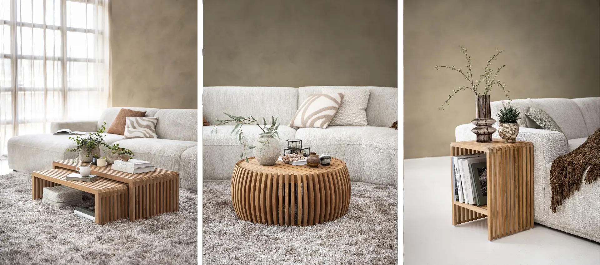 Collectie Steve, bestaande uit een ronde salontafel, salontafel set, een laptoptafel, een nachtkastje én een banktafel in twee maten, laat zien dat het niet moeilijk hoeft te zijn om je ruimte een warme en doordachte look te geven. Het speelse contrast van de latjes in combinatie met de warme teakkleur en afgeronde hoeken maakt deze serie een verrijking voor ieder interieur.
