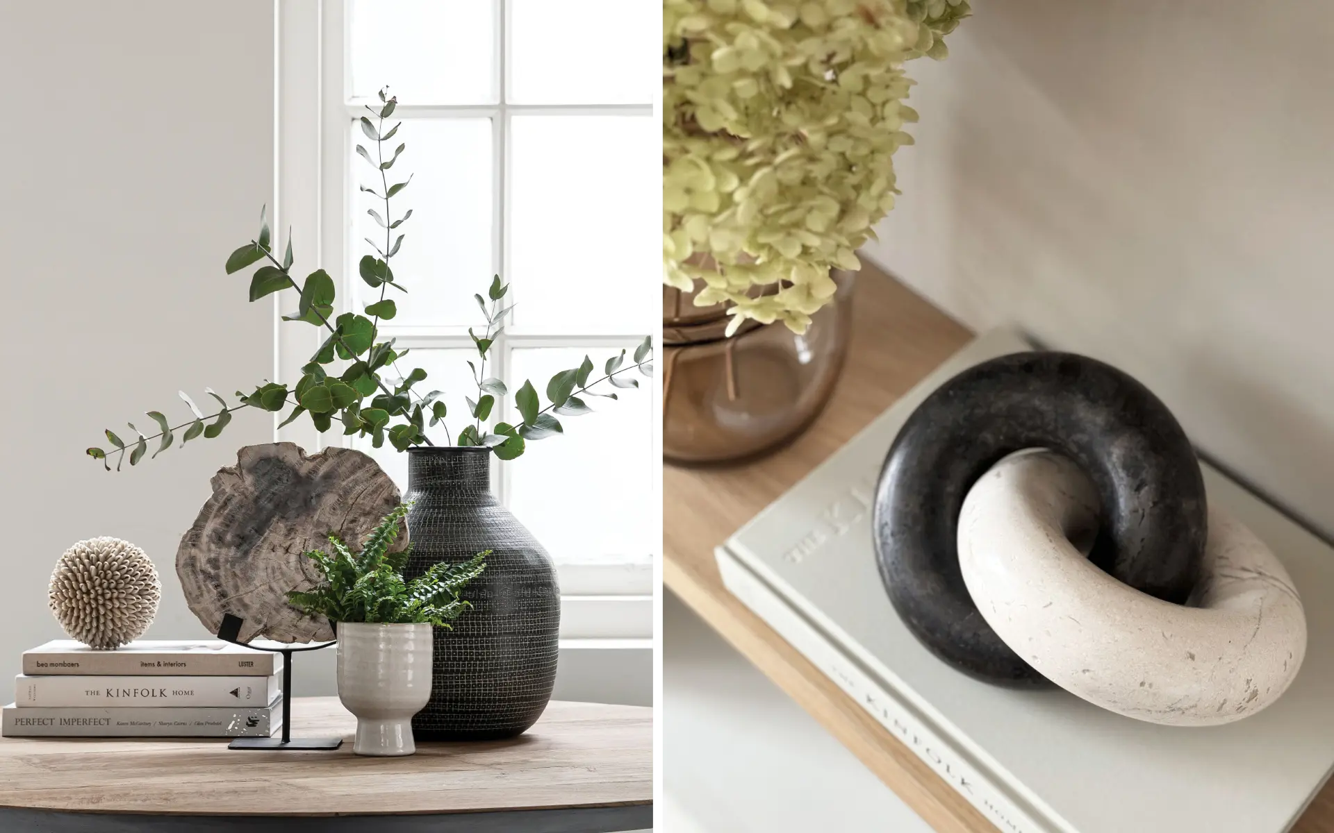 Denk bijvoorbeeld aan een keramieken vaas met een linnen lampenkap of een glazen windlicht naast een houten beeldje. Door materialen te herhalen in de rest van je interieur, zorg je voor een mooi samenhangend geheel.