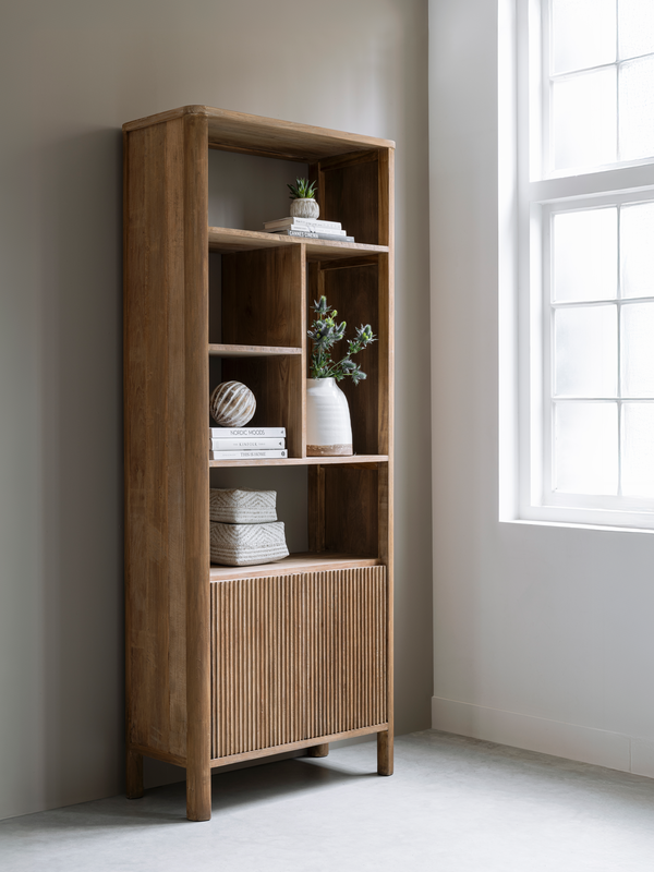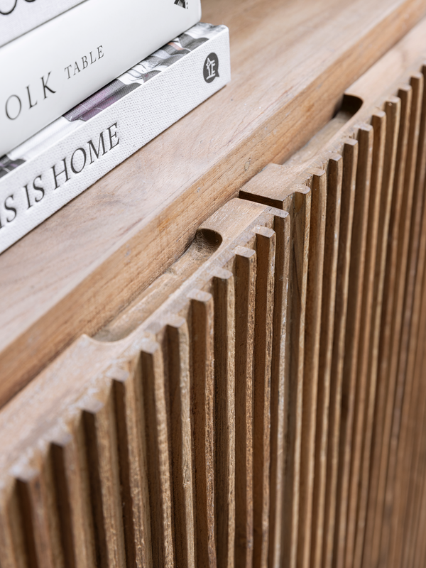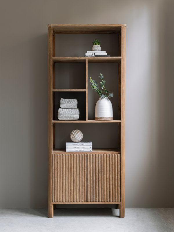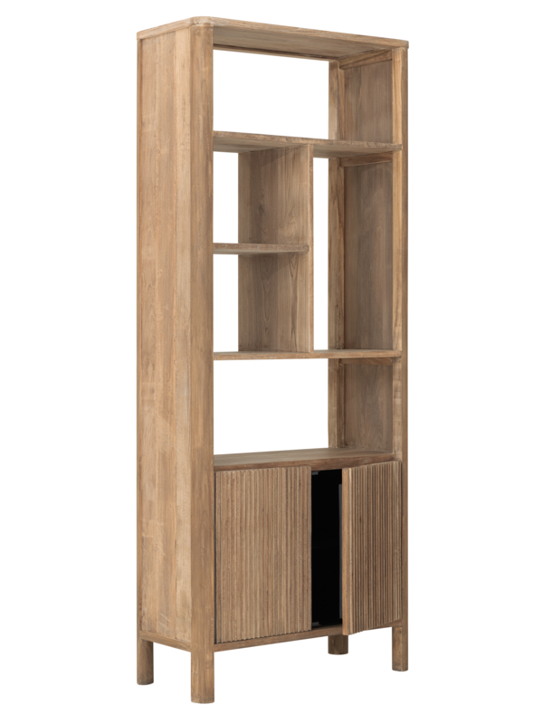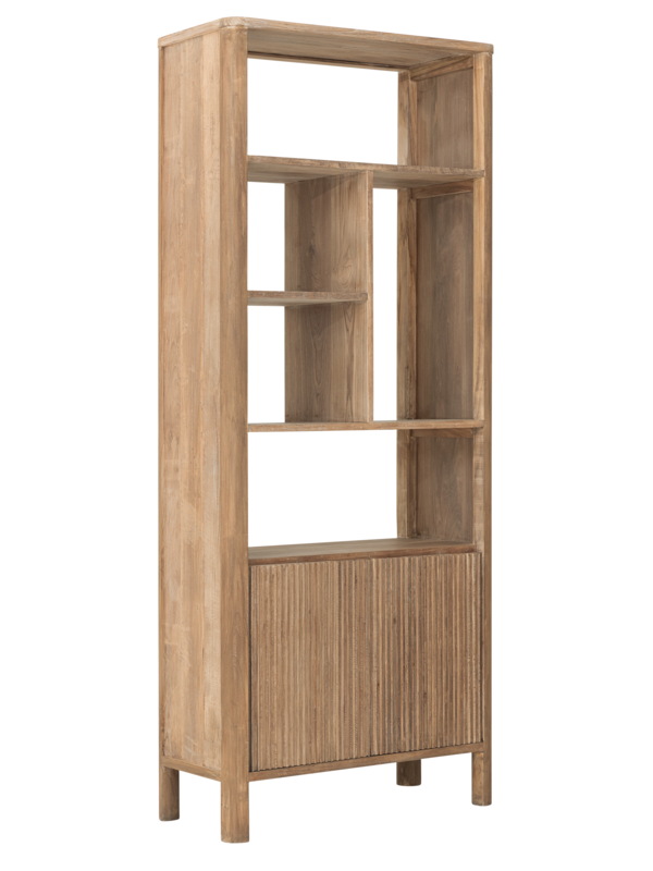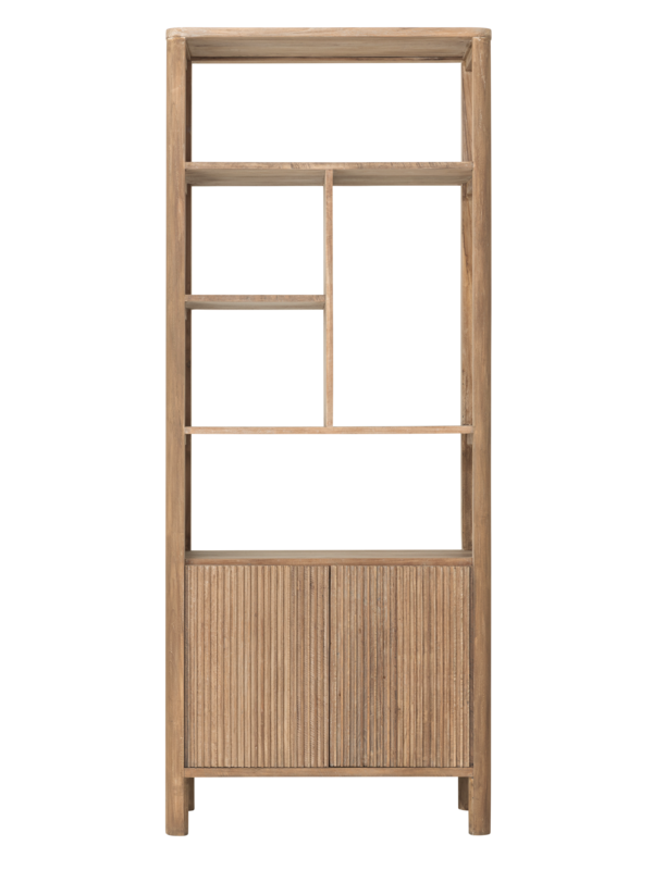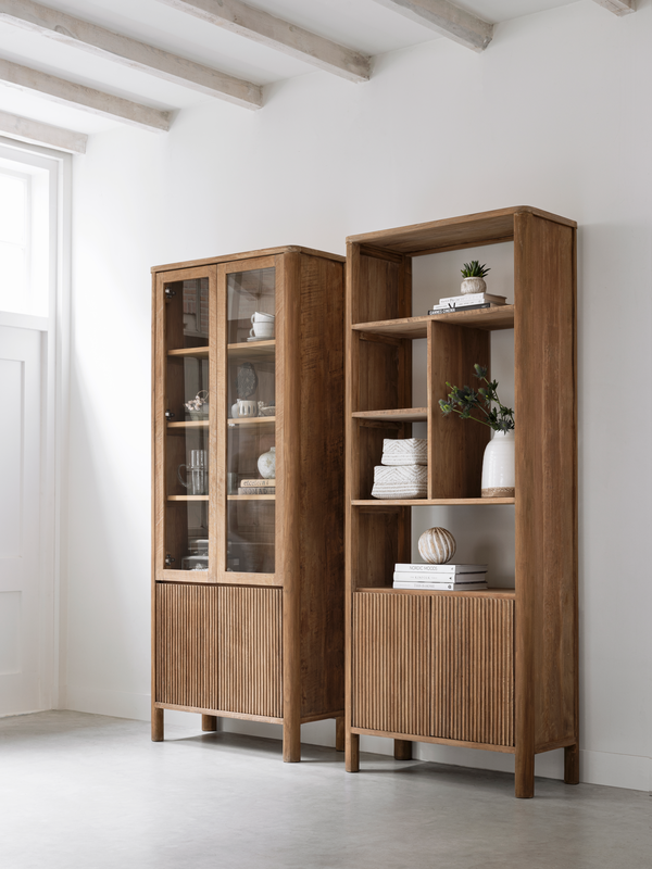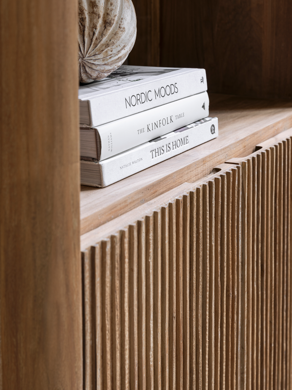 Presenteer je mooiste boeken of decoratieve objecten in boekenkast Sumba. Gemaakt van gerecycled teakhout, heeft deze kast een warme en natuurlijke uitstraling met een duurzaam karakter. De open vakken geven ruimte voor je favoriete items, terwijl het onderste deel met verticale houten latjes zorgt voor opbergruimte. Met zijn minimalistische vormgeving sluit Sumba perfect aan bij de Japandi woonstijl.