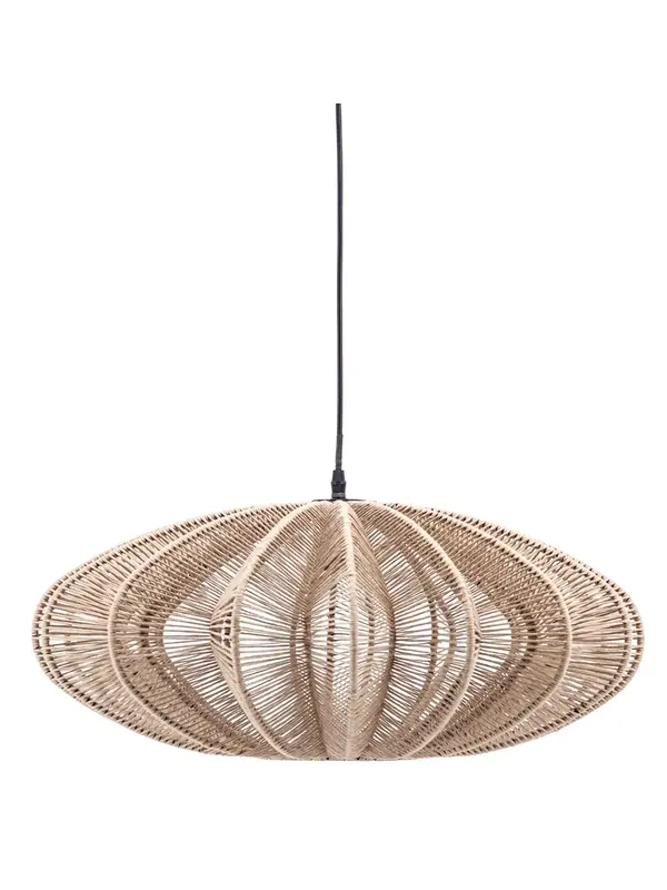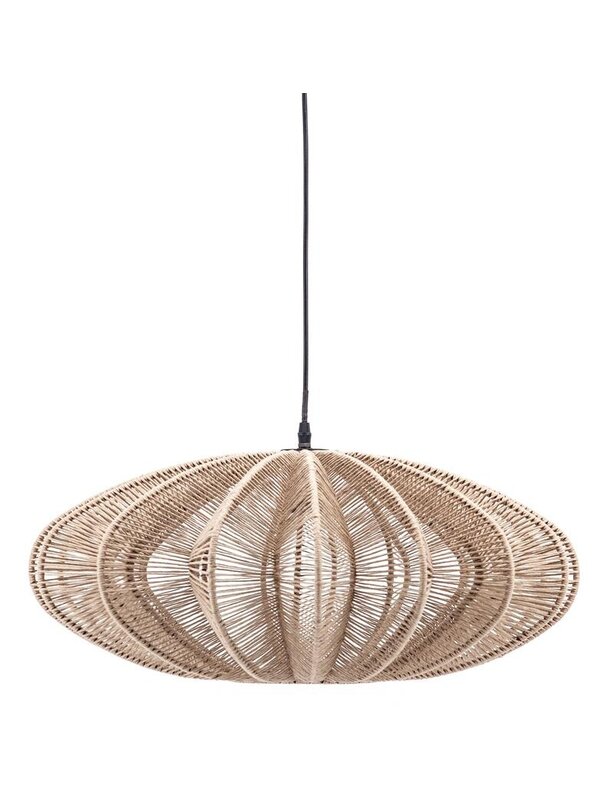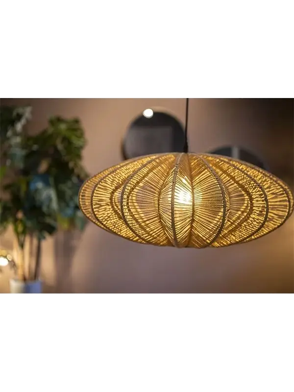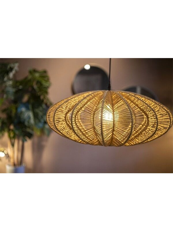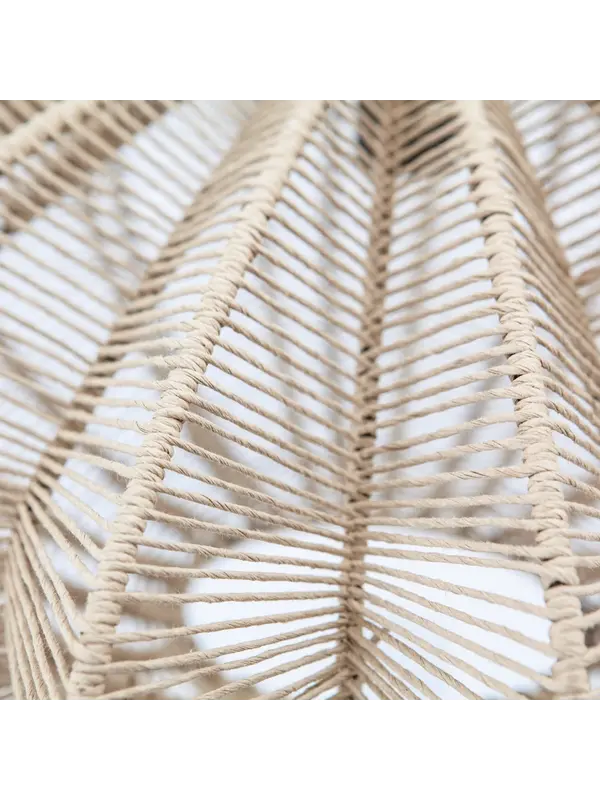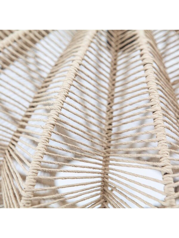 Door zijn vorm en het materiaal is hanglamp Nimbus een sfeervolle keuze. Hij is namelijk gemaakt van touw. Hierdoor heeft de lamp, ondanks de spannende en dynamische vorm, een rustige uitstraling. De kap is bewerkt met een blanke lak en heeft een afmeting van 33xØ63 cm. Overdag is de Nimbus al een plaatje, maar 's avonds brengt hij ook nog eens prachtige schaduwen aan op de muur.