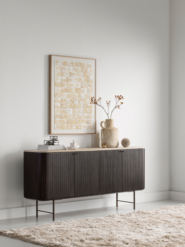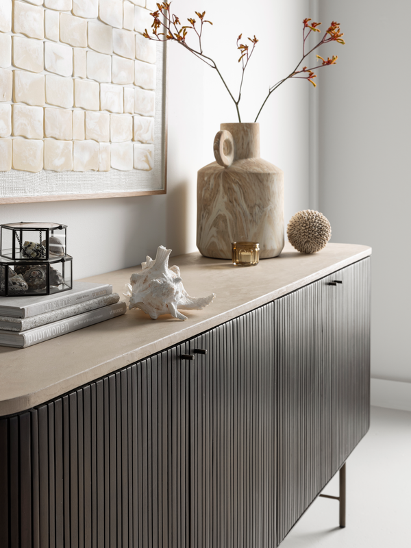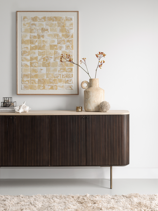 De zacht afgeronde hoeken geven dressior Maroon een uitnodigende uitstraling, waardoor hij een stijlvolle blikvanger is in elk interieur. De warme donkerbruine tint van het mahoniehout vormt een prachtig geheel met het verfijnde mortex blad en de metalen details in Anodic Brown. De verticale latjes geven de Maroon Collectie een moderne uitstraling die helemaal past bij nu.