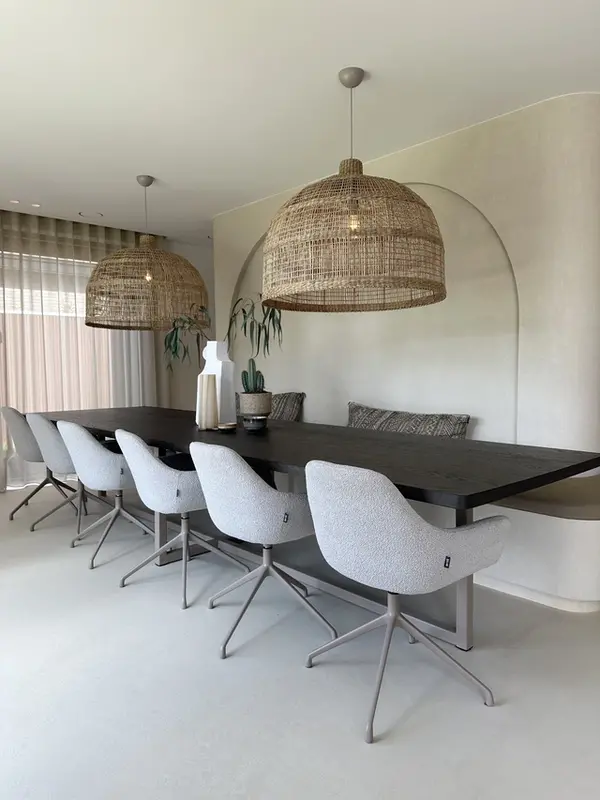 Eetkamerstoel Ids van het merk Dyyk is een comfortabele stoel die zich thuis voelt in elke interieurstijl. De aluminium draaivoet maakt de stoel beweeglijk en dynamisch. Dat vormt een mooi contrast met de strakke lijnen van de zitting en het rug gedeelte.