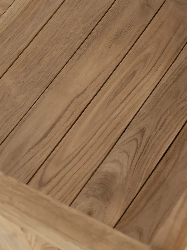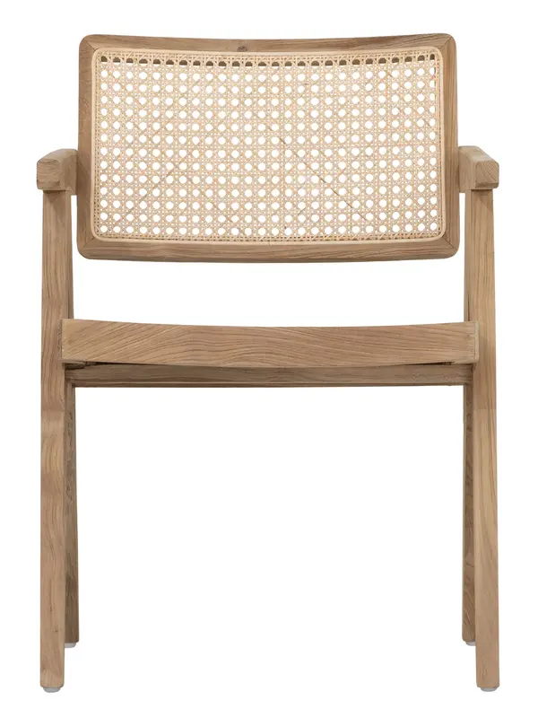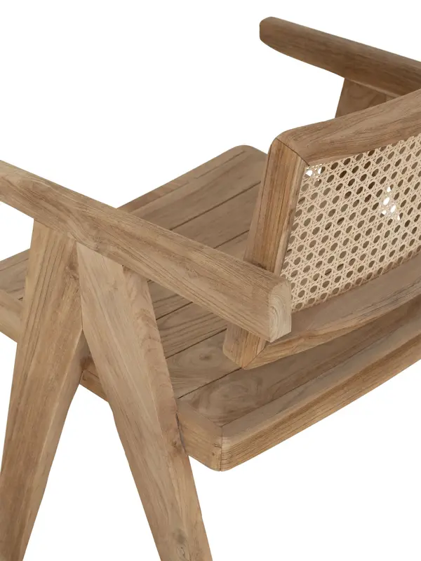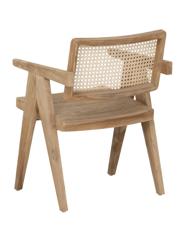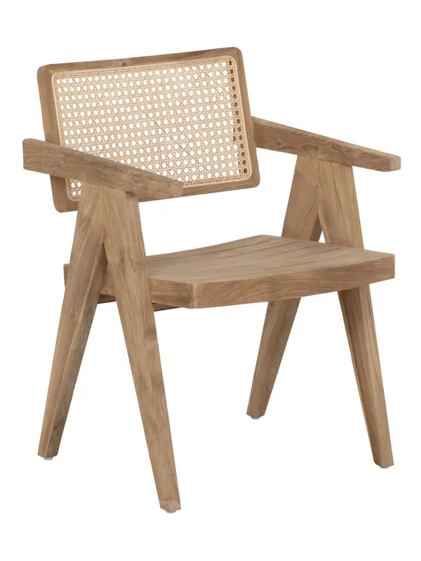 Eetkamerstoel Nice is gemaakt van geborsteld teakhout en heeft een rugleuning van webbing, wat zorgt voor een speelse touch. Nice is geschikt voor zowel binnen als buiten.