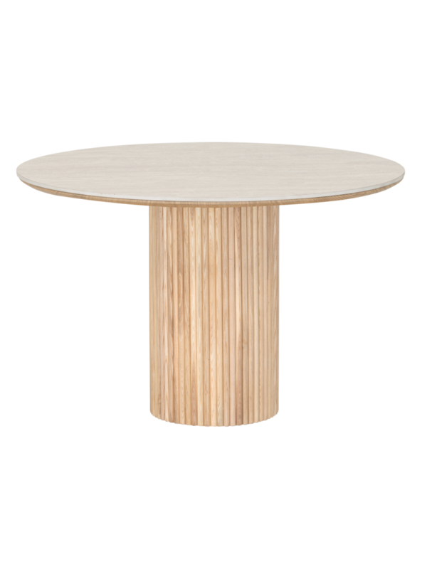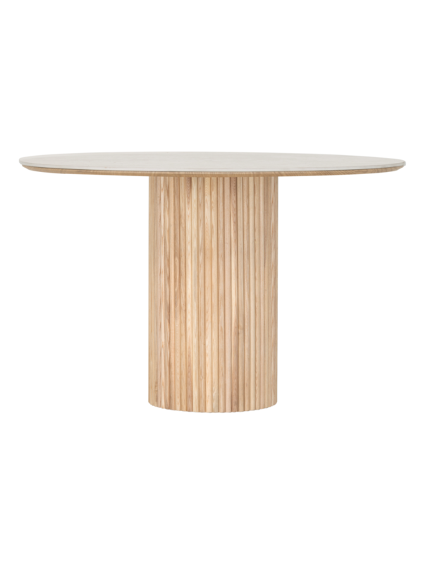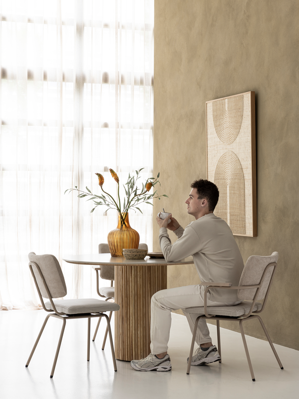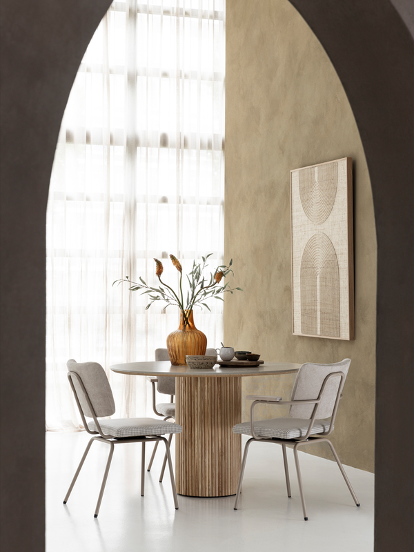 De halfronde houten latjes van tafel Dario zijn helemaal van nu. Ze zorgen voor een speels lijnenspel en een natuurlijke uitstraling die perfect past binnen de Japandi stijl.