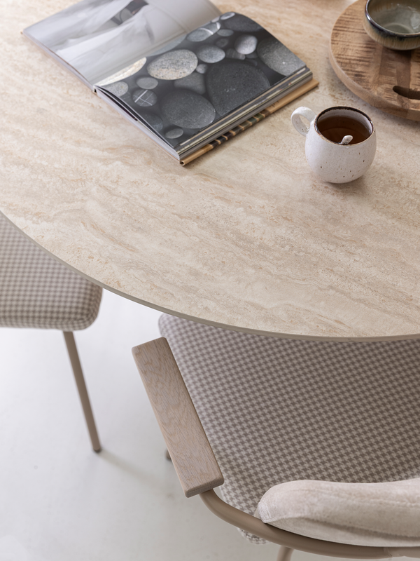 Het zandkleurige blad is gemaakt van sintered stone, een een innovatief en uiterst duurzaam materiaal. Dit wordt gemaakt door natuurlijke mineralen onder extreem hoge druk en temperatuur samen te persen tot een solide plaat. Het resultaat is een blad dat niet alleen prachtig oogt, maar ook uitzonderlijk sterk is. Het is kras- en vlekbestendig, hittebestendig en eenvoudig in onderhoud. Dankzij de hoogwaardige eigenschappen blijft Dario jarenlang mooi.