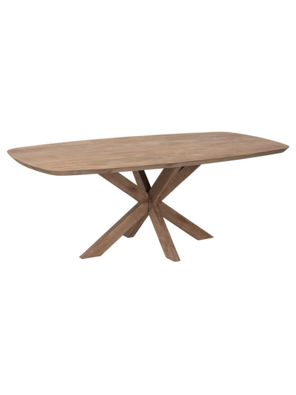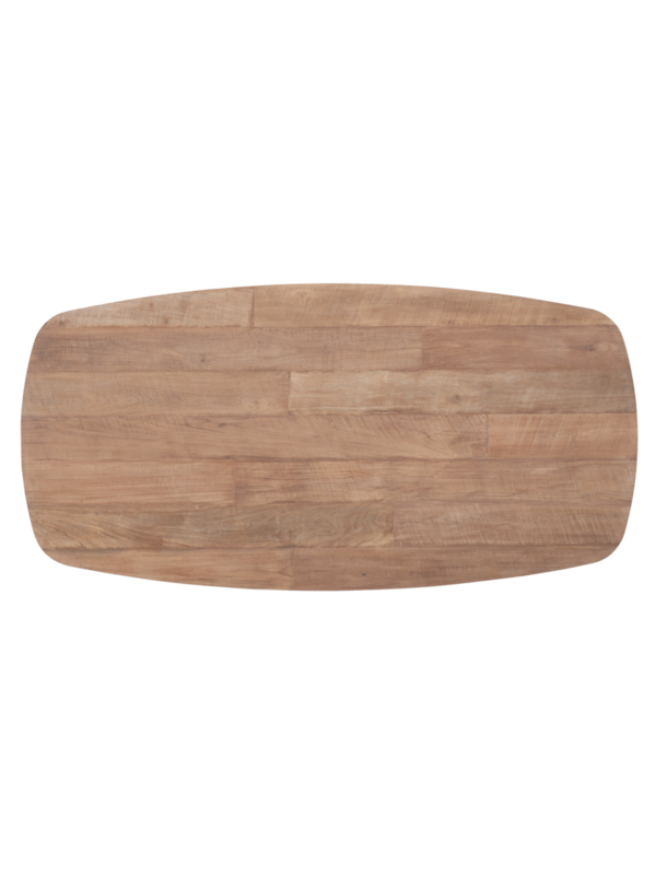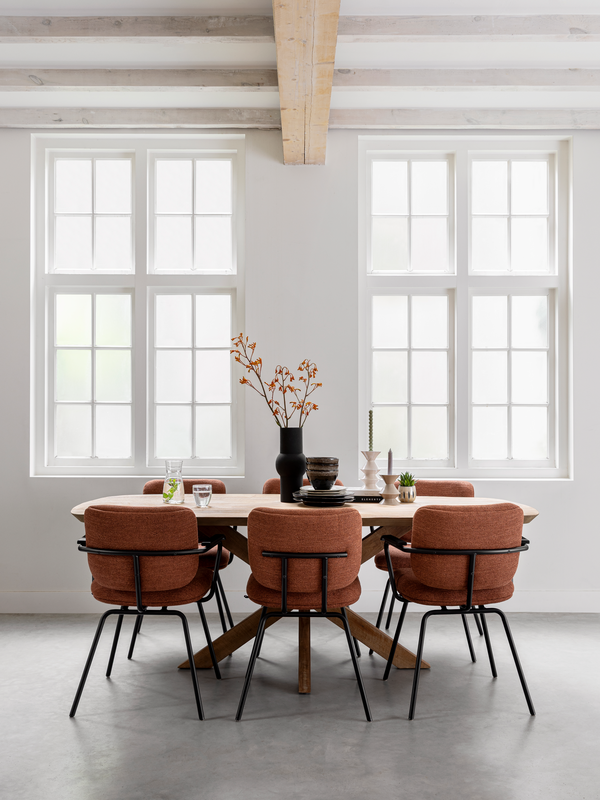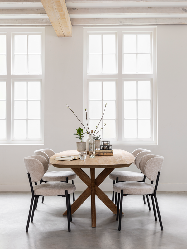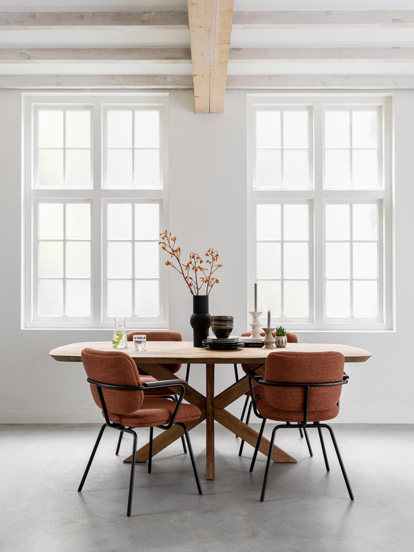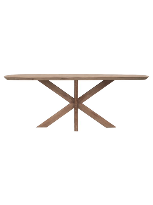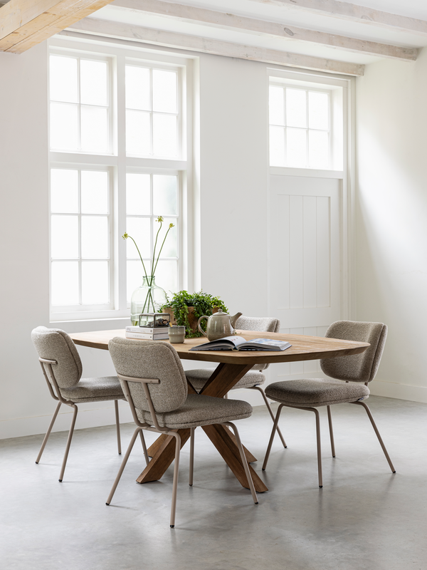 Breng karakter en een tijdloos design samen in je interieur met de Eettafel Mito. Deze stijlvolle deens ovale tafel is gemaakt van gerecycled teakhout, wat elke tafel uniek maakt door zijn nerfstructuur en subtiele kleurverschillen. Het blad rust op een kruisvormig onderstel, eveneens van teakhout. De centrale poot zorgt voor optimale beenruimte en maakt het tafelen extra comfortabel. Verkrijgbaar in twee maten.