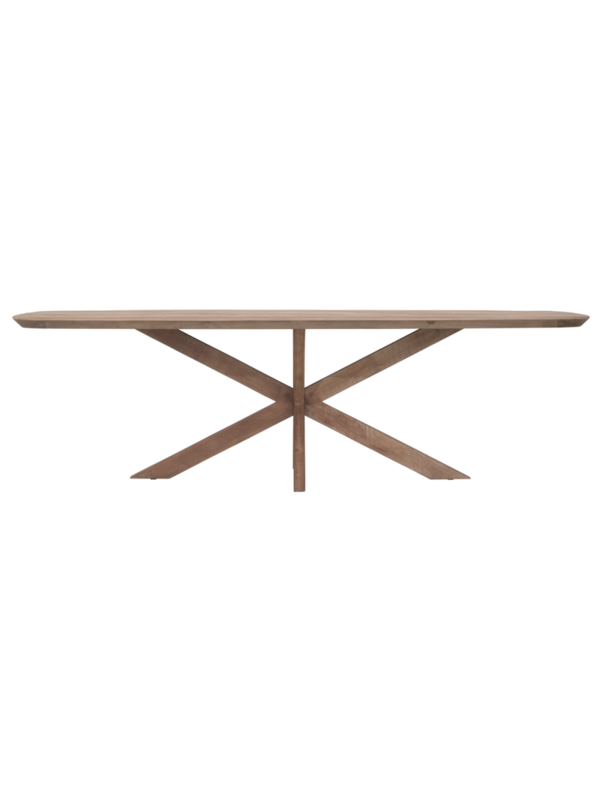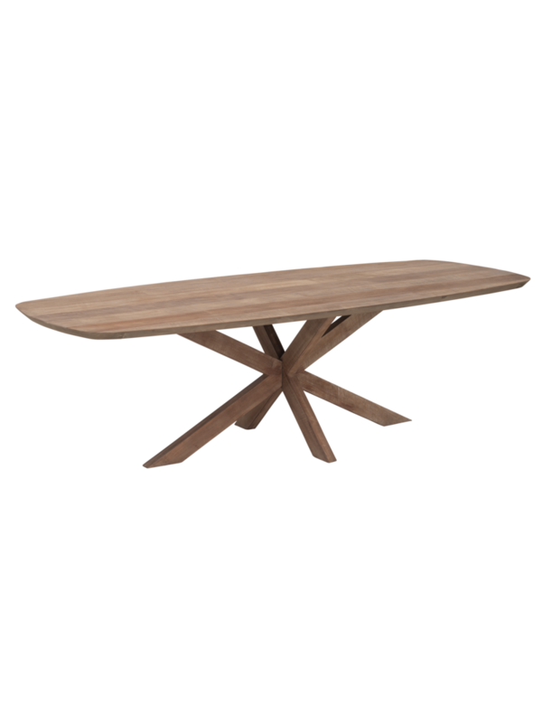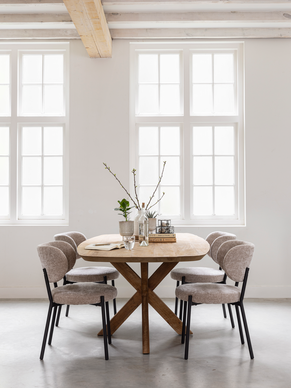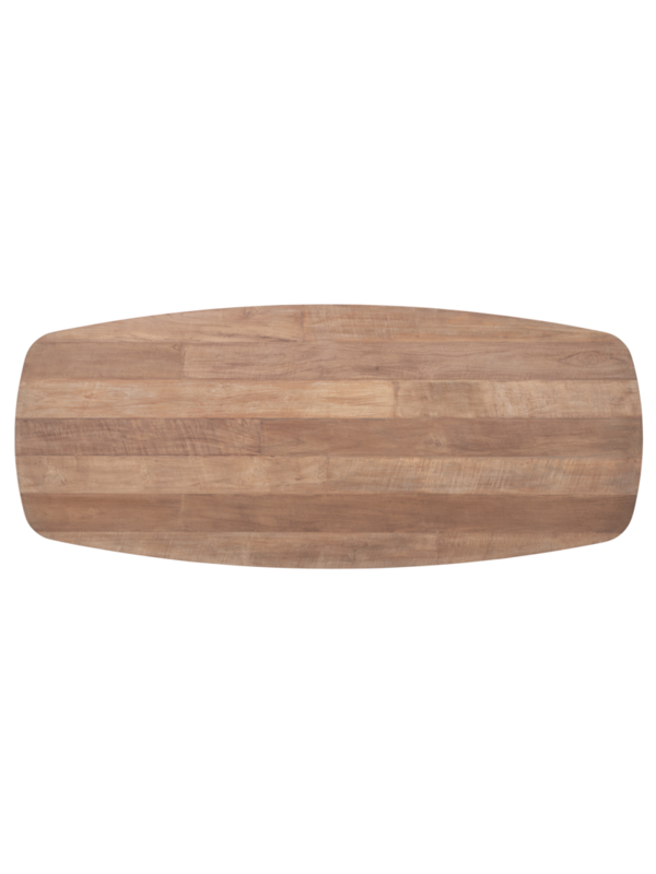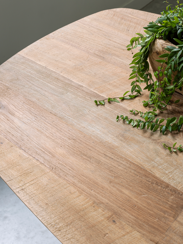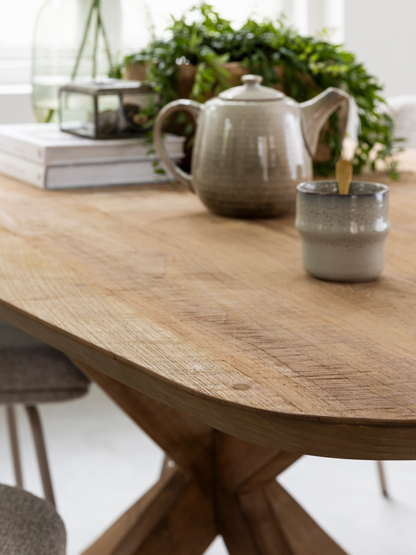 Breng karakter en een tijdloos design samen in je interieur met de Eettafel Mito. Deze stijlvolle deens ovale tafel is gemaakt van gerecycled teakhout, wat elke tafel uniek maakt door zijn nerfstructuur en subtiele kleurverschillen. Het blad rust op een kruisvormig onderstel, eveneens van teakhout. De centrale poot zorgt voor optimale beenruimte en maakt het tafelen extra comfortabel. Verkrijgbaar in twee maten.