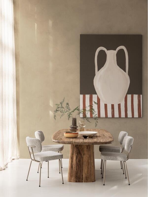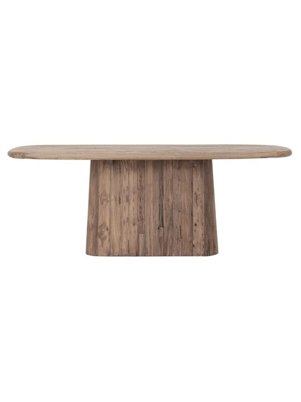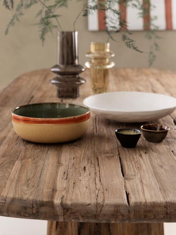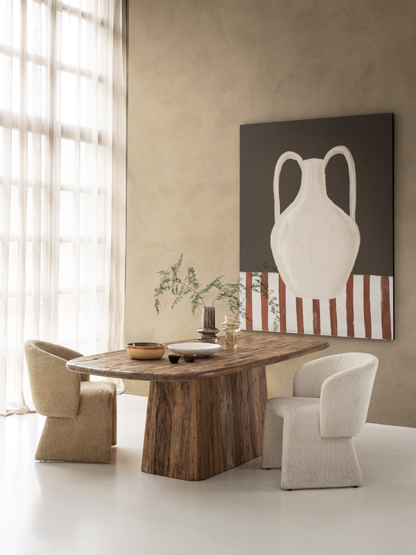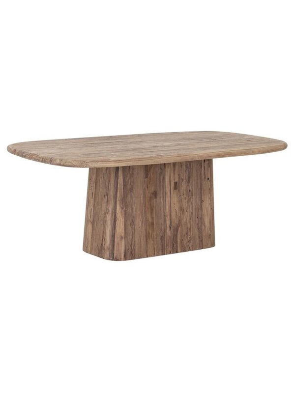 Eettafel Uluwatu combineert karakter en functionaliteit en is perfect voor gezellige diners en speciale momenten met familie en vrienden. De tafel is gemaakt van rustiek teakhout, afkomstig van oude Indonesische huizen. Dit hout heeft een prachtig geleefd uiterlijk, ontstaan door jaren van vochtopname en drogen. Het robuuste hout is van hoge kwaliteit en heeft een unieke, warme uitstraling vol karakter. De solide, taps toelopende poot vormt een stevig fundament en benadrukt het tijdloze design van de tafel.