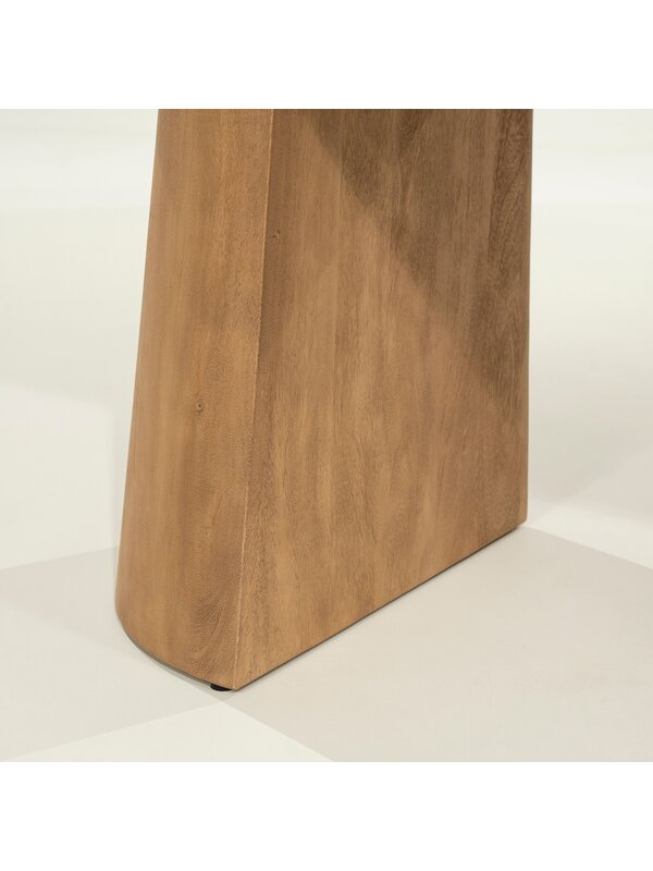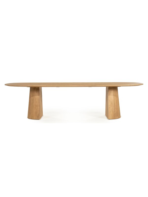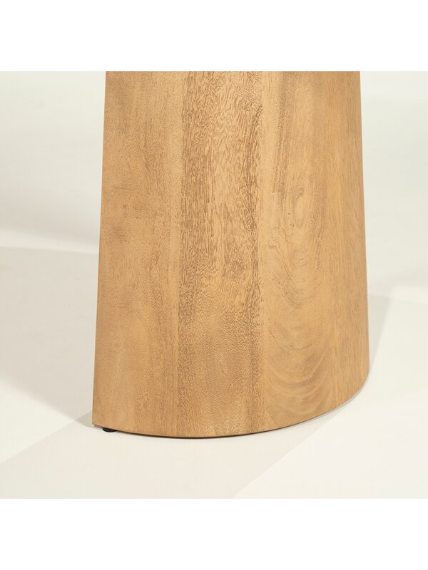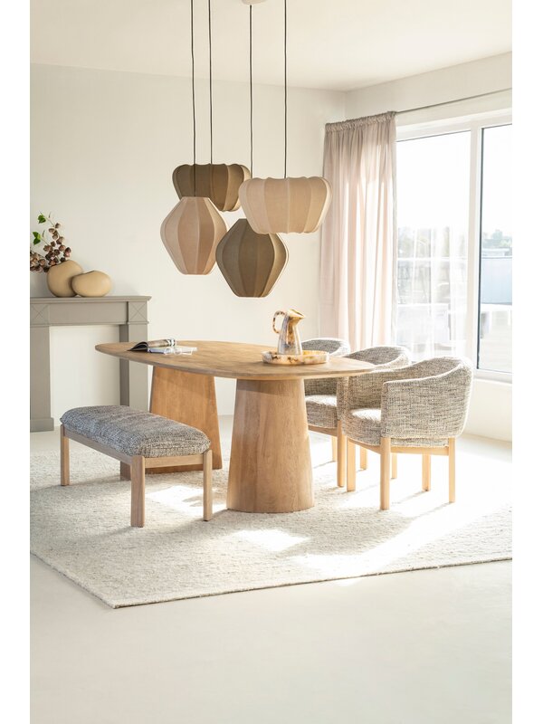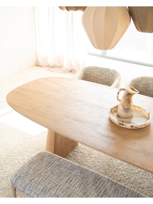 Eettafel Lune van Eleonora is een blikvanger voor ieder interieur. Het deens ovale blad, gemaakt van mangohout, zorgt voor een warme en natuurlijke uitstraling, terwijl de twee robuuste, organisch gevormde poten de tafel een modern karakter geven. Dankzij het deens ovale design ontstaat er meer ruimte rondom de tafel en kijk je elkaar altijd prettig aan, wat Lune uitermate geschikt maakt voor lange avonden tafelen. De tafel is verkrijgbaar in naturel en lichtbruin en in twee royale afmetingen.