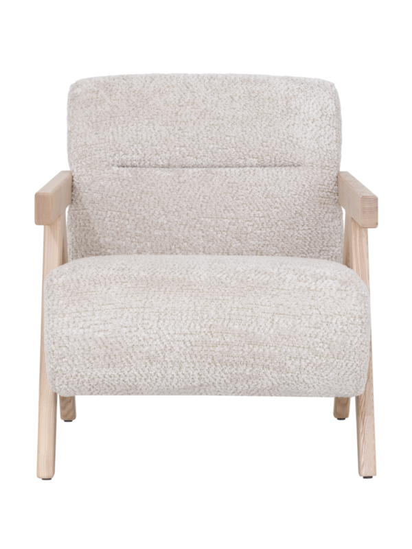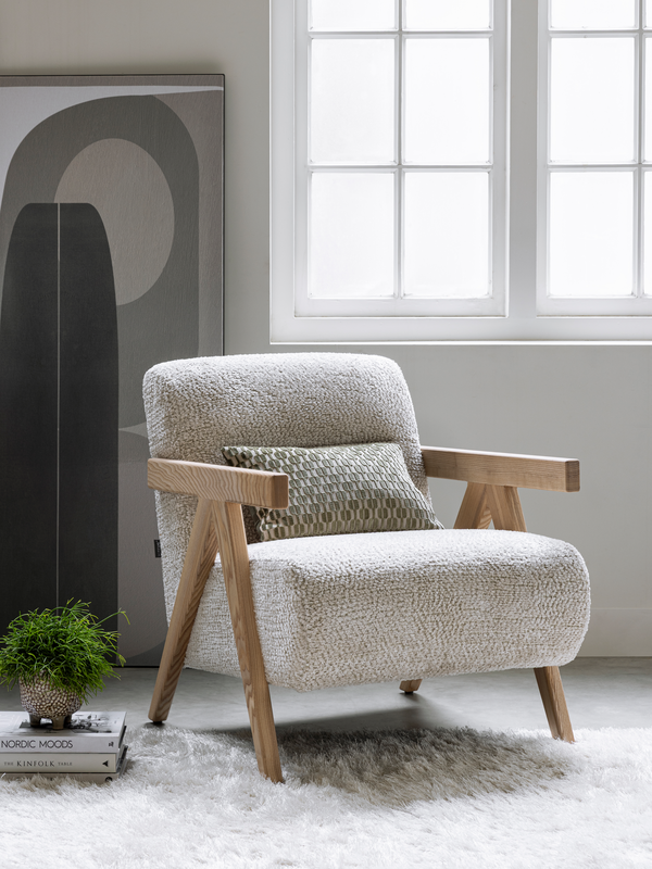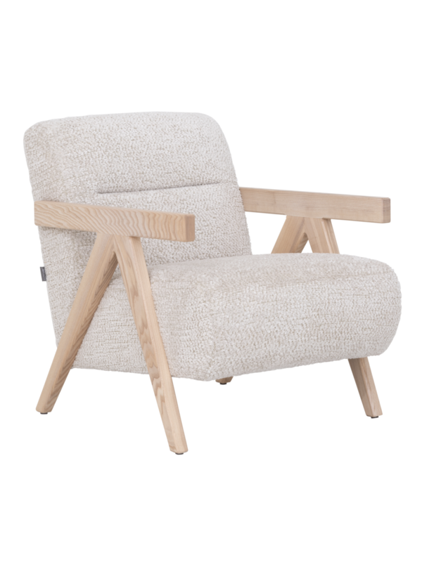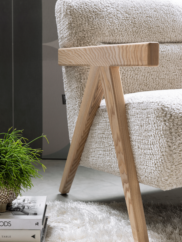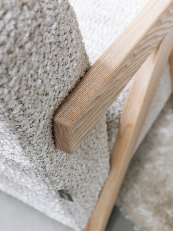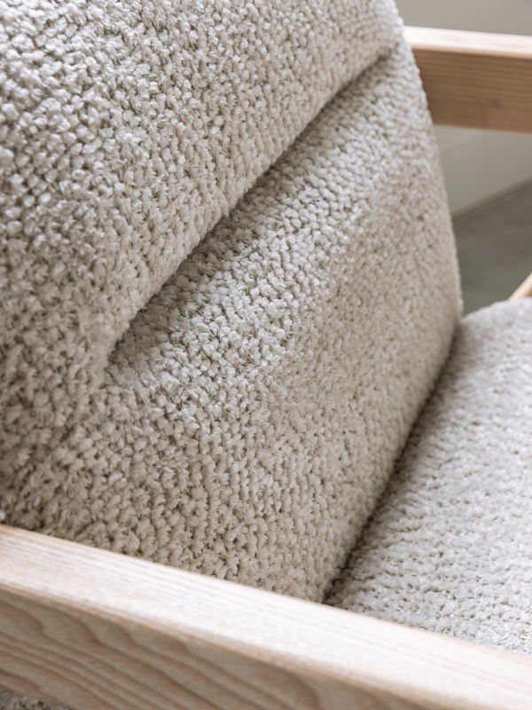 Ontspan in Bobby en ervaar de perfecte balans tussen comfort en design. De zachte bouclé bekleding voelt warm en uitnodigend, terwijl het eikenhouten frame een natuurlijke uitstraling toevoegt die perfect past bij een Japandi interieur.