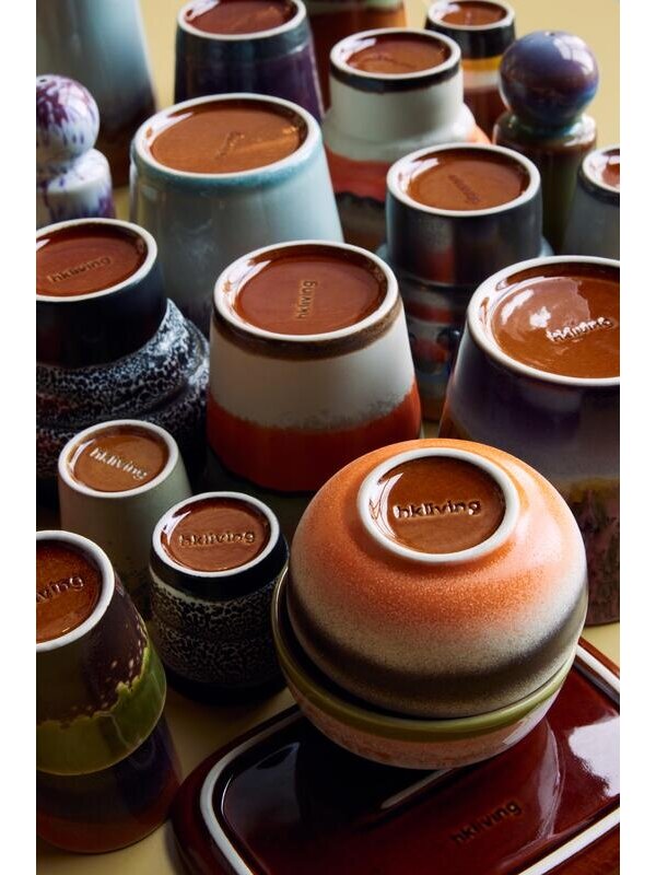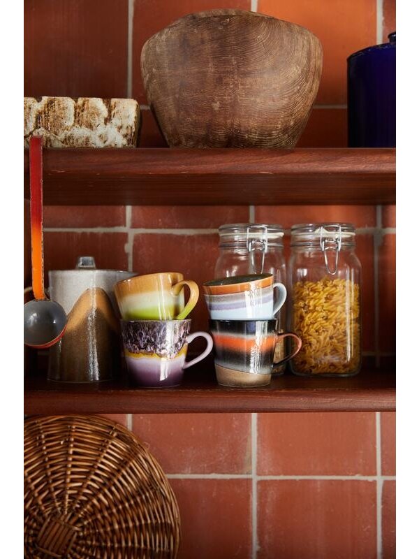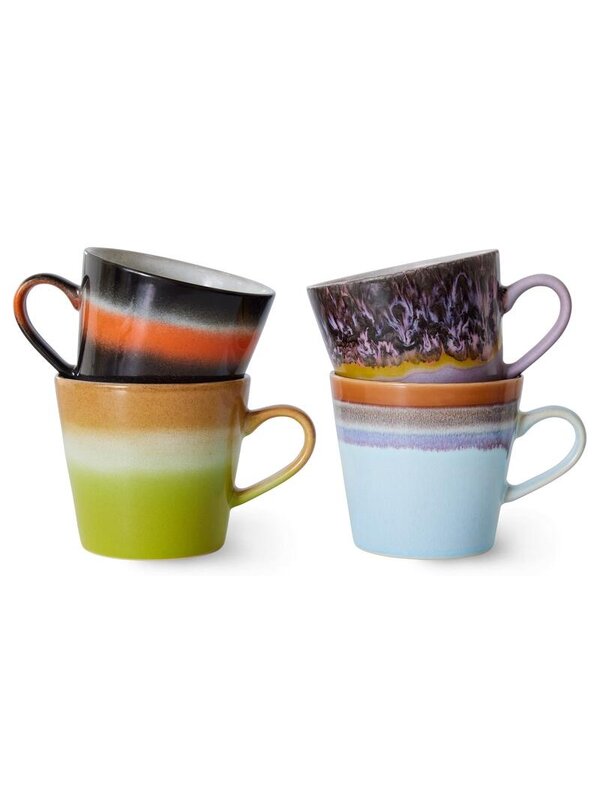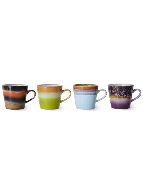 Met de 70's Ceramic Cappuccino mok set van 4 van HKliving geniet je elke ochtend nog meer van je vers gezette kop cappuccino. Trouw blijvend aan de bekende jaren zeventig stijl van HKliving zijn de mokken in verschillende kleuren gemaakt. Elke mok is handgemaakt en daarom uniek. Tip: geef deze set als cadeautje bij bijvoorbeeld een housewarming.
