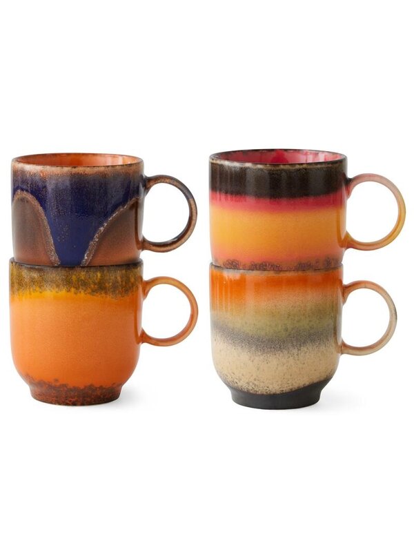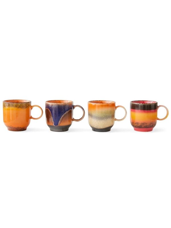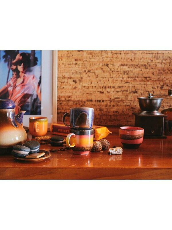 Voeg een vleugje kleur en levendigheid toe aan jouw koffieroutine met de 70's Ceramic koffiekop met oor set van 4 van HKliving. Geïnspireerd door het kleurrijke en speelse design uit de jaren 70, brengt deze set van vier koffiemokken een unieke retro charme in jouw keuken. Elke mok is vervaardigd uit keramiek en is voorzien van hun eigen kleuren en organisch patroon, waardoor elk stuk een unieke uitstraling heeft. De heldere en gedurfde kleuren brengen een speelse flair naar jouw koffiemomenten, terwijl het stevige handvat en het royale formaat perfect is voor het serveren van jouw favoriete koffiespecialiteiten.
