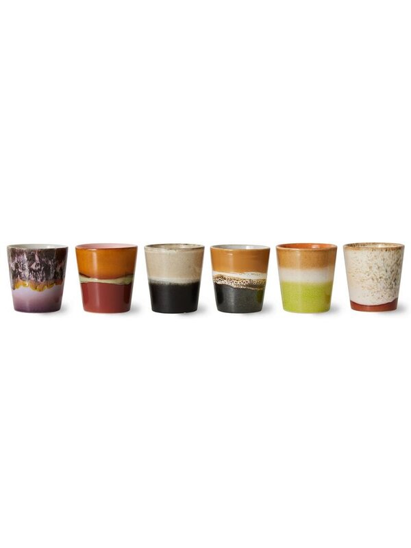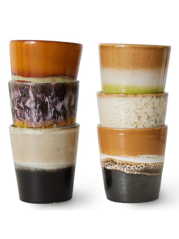 Met de Ceramic 70's mokken set van 6 van HKliving geniet je elke ochtend nog meer van je vers gezette kopje koffie. Trouw blijvend aan de bekende jaren zeventig stijl van HKliving zijn de mokken in verschillende kleuren gemaakt. Elke mok is handgemaakt en daarom uniek. Tip: geef deze set als cadeautje bij bijvoorbeeld een housewarming.