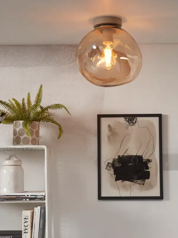 De plafonniere Helsinki is een verfijnde blikvanger met een uniek ontwerp en een surrealistische vorm van de glazen bol. Met afmetingen van 26 x 26 x 28 cm straalt deze lamp een elegante charme uit. Het amberkleurige glas voegt warmte en stijl toe, terwijl de surrealistische vorm een artistiek tintje geeft aan het geheel. Deze plafonniere combineert moeiteloos een eigentijdse uitstraling met een vleugje kunstzinnigheid, een aanwinst voor elke ruimte. Laat je ruimte schitteren, want een lamp is meer dan licht; het is een statement voor jouw unieke stijl.