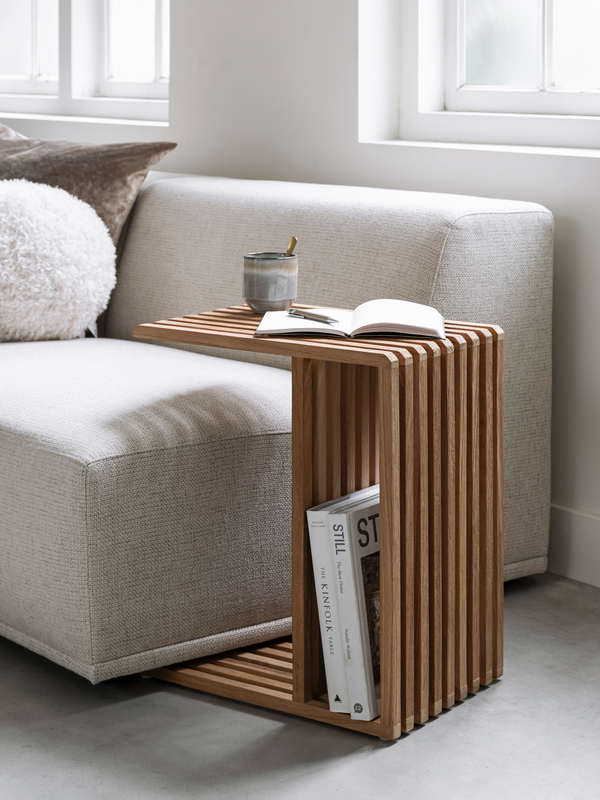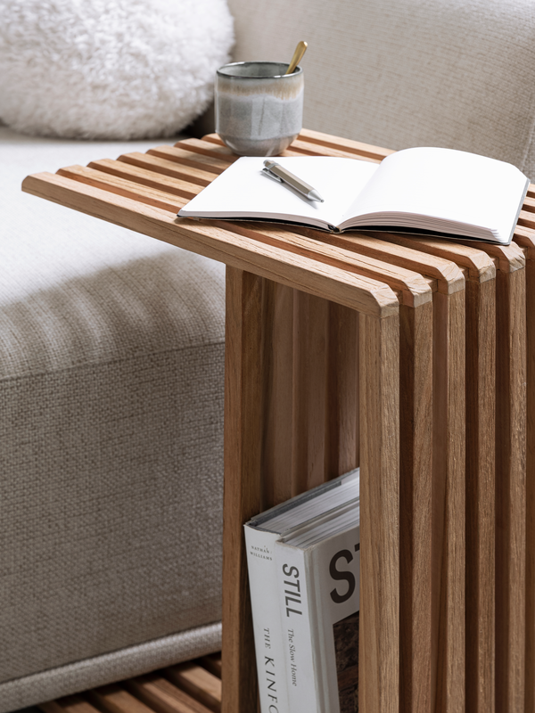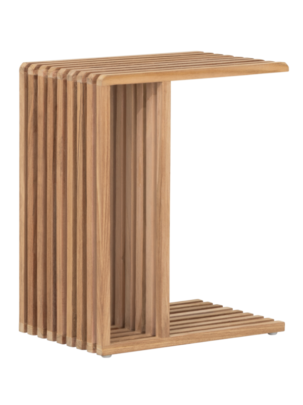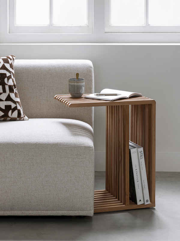 Laptoptafel Steve combineert functionaliteit met een eigentijds design. Gemaakt van geborsteld teakhout en uitgevoerd met speelse latjes, brengt hij stijl in je interieur. Dankzij het slimme ontwerp schuif je de tafel eenvoudig over de bank, zodat je comfortabel kunt werken of een kop koffie binnen handbereik hebt. Onderin is er ruimte om boeken of tijdschriften op te bergen, waardoor de tafel niet alleen praktisch maar ook multifunctioneel is.