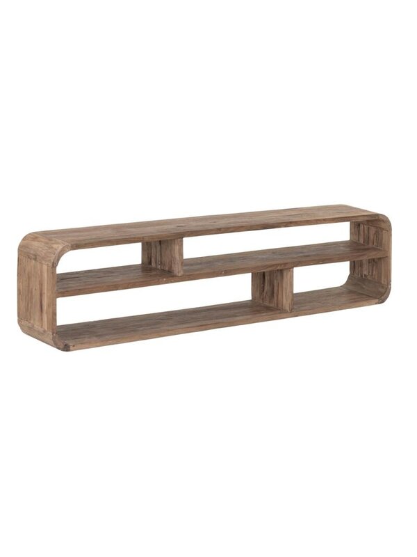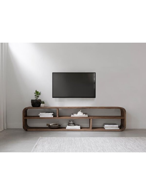 TV-meubel Corso heeft een open ontwerp, ideaal voor het opbergen en tonen van tv-apparatuur of decoratie. Door de natuurlijke variaties in de nerf en kleur van het hout is elk meubel uniek. De lichte, open structuur past zich eenvoudig aan verschillende interieurstijlen aan, terwijl de robuuste afwerking een warme uitstraling geeft.