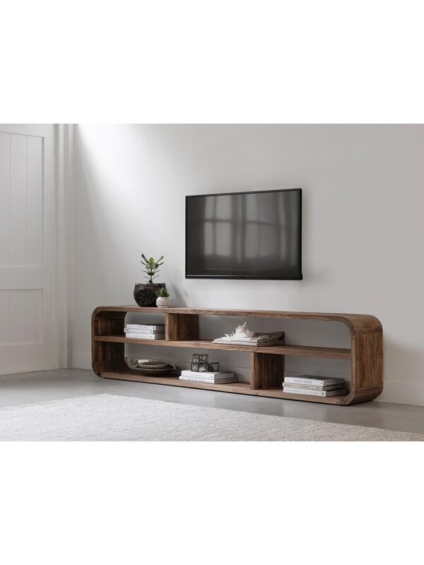 De Corso collectie van het merk MUST Living is gemaakt van extreem rustiek teakhout, waarbij elk stuk uniek is. De ronde vormen dragen bij aan een zachte, speelse look die het ontwerp versterkt. Dankzij het open design komt de natuurlijke schoonheid van het hout volledig tot zijn recht, terwijl de meubels tegelijkertijd functionele opbergruimte bieden zonder de ruimte te overweldigen.