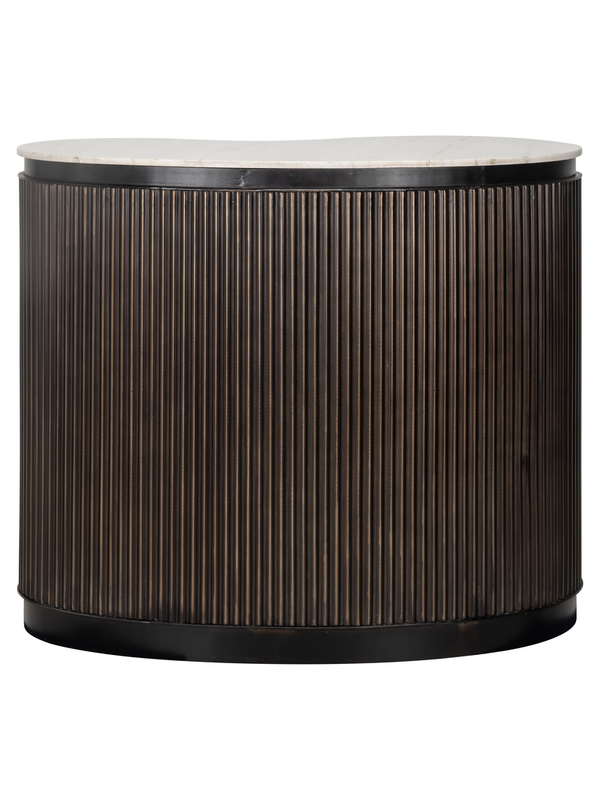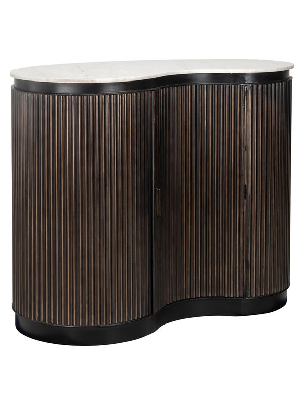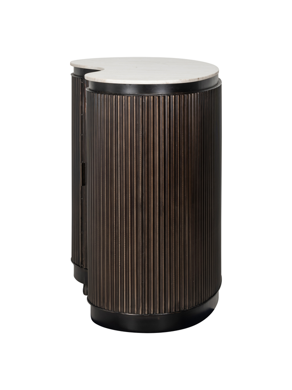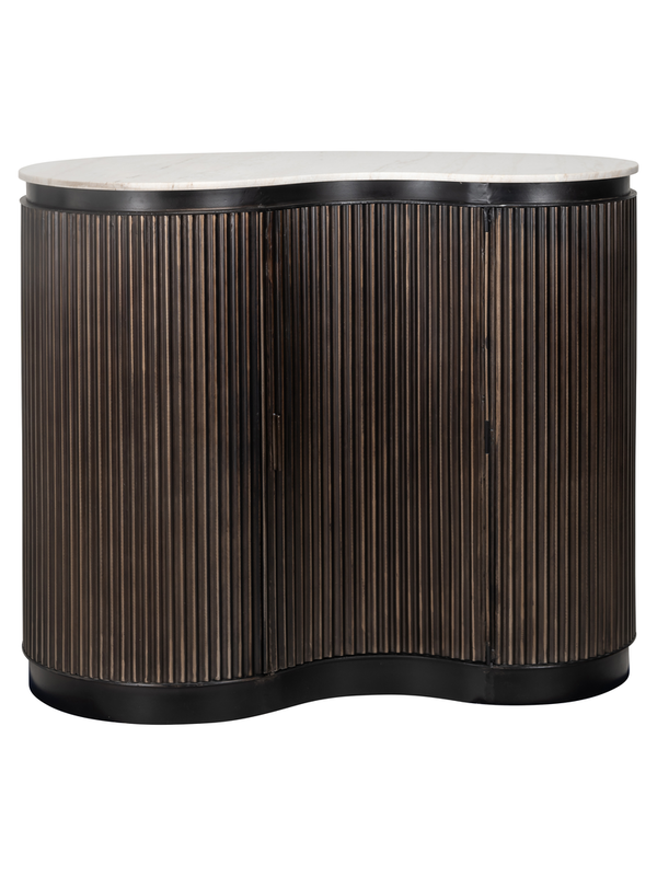 De Bar Mayfield van Richmond Interiors is dé perfecte mix van functionaliteit en elegantie. Het warme mangohouten frame, afgewerkt in een diepe bruine tint, straalt karakter en klasse uit. Bovenop prijkt een marmeren blad dat niet alleen luxe oogt, maar ook elke bar uniek maakt dankzij de natuurlijke adering.Achter de stijlvolle deur schuilt een verrassend ruime opbergruimte. ideaal voor je favoriete flessen, glazen of baraccessoires. Of je hem nu plaatst in de woonkamer of je eigen home bar, de Mayfield is een echte aanwinst die sfeer en stijl brengt in elke ruimte.