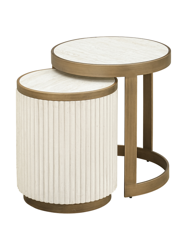 De Richmond bijzettafel set Tivoli voegt direct een gevoel van luxe en elegantie toe aan je interieur. De combinatie van goudkleurig metaal en wit keramiek geeft de set een chique, moderne uitstraling. Dankzij het verfijnde ontwerp passen de tafels moeiteloos in elke ruimte, of je ze nu samen gebruikt of los van elkaar plaatst. Perfect om een vleugje klasse toe te voegen aan je woonkamer, slaapkamer of hal.