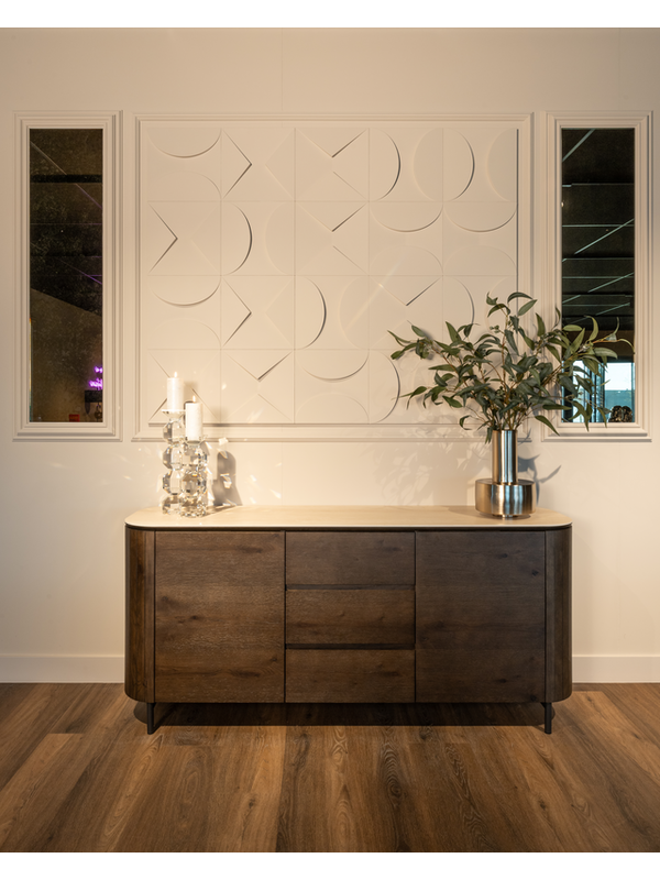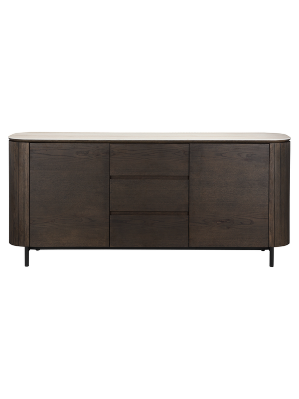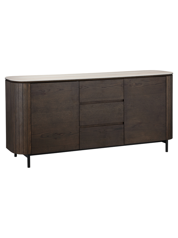 Dressoir Ritz van het merk Richmond Interiors combineert stijl en functionaliteit. Het donker eikenfineer in combinatie met het faux travertin blad geeft dit meubel een luxueuze uitstraling. Met zijn royale opbergruimte houd je je interieur altijd netjes en geordend. Combineer het dressoir met de andere meubels uit de Ritz collectie.