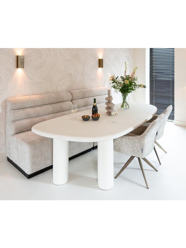De Bloomstone collectie van Richmond Interiors staat voor modern minimalisme met een zachte twist. Elk meubelstuk is uitgevoerd in helder wit en kenmerkt zich door vloeiende, organische vormen. De strakke lijnen en rustige uitstraling maken deze collectie perfect voor een eigentijds interieur waarin eenvoud en elegantie centraal staan
