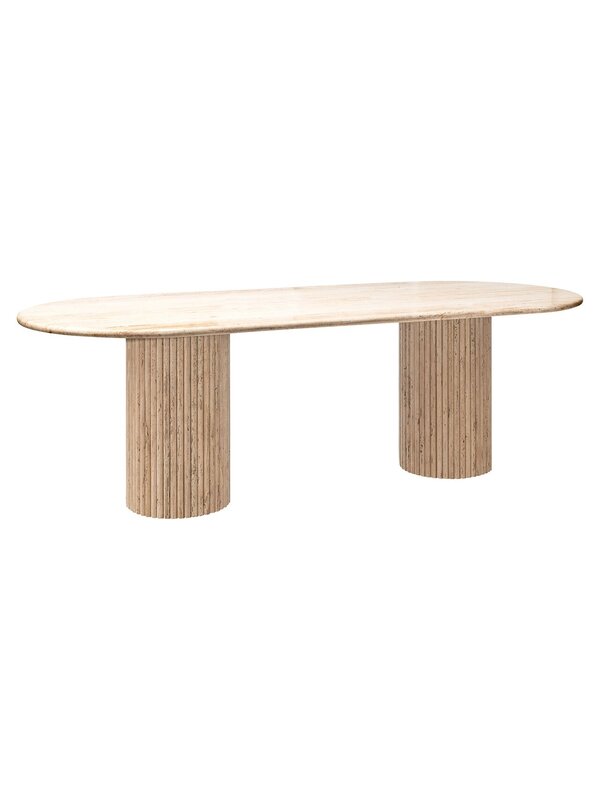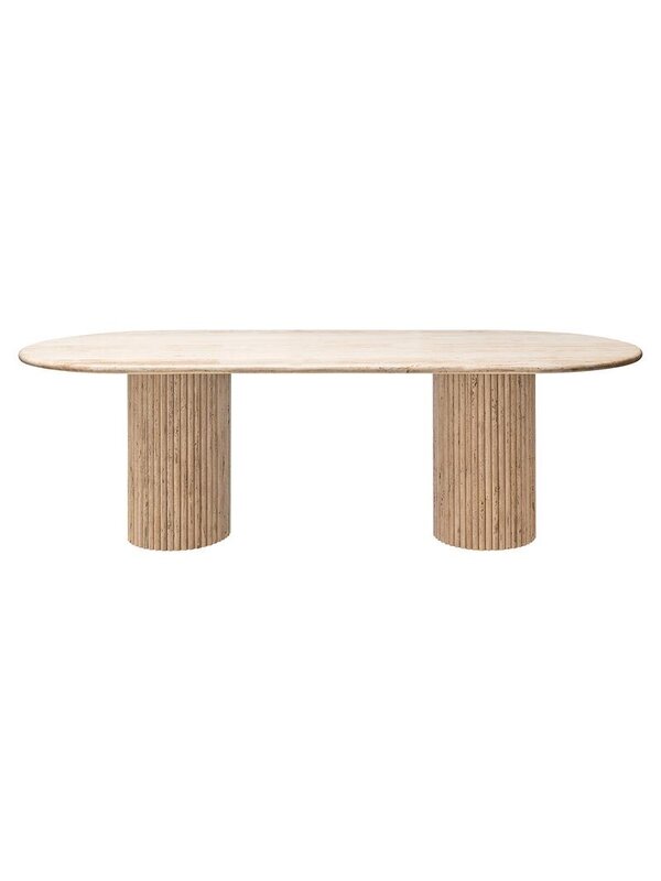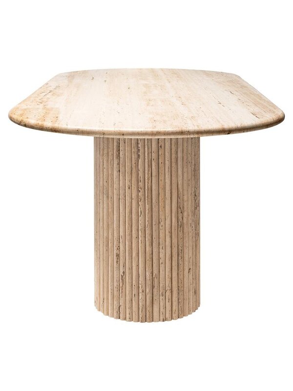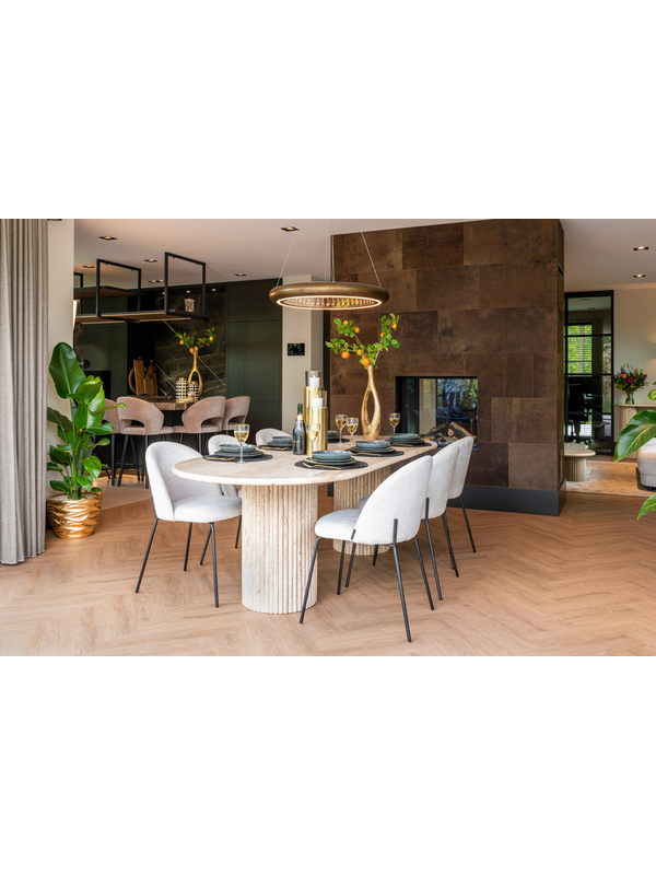 De La Cantera eettafel van Richmond Interiors is een echte eyecatcher. Met haar ovale vorm, elegante lijnen en het rijke travertin blad brengt ze direct sfeer en karakter in je eetruimte. De bijzondere afwerking van de poten geeft de tafel een uniek silhouet en een luxe, natuurlijke uitstraling. Elk exemplaar is anders en dat maakt haar juist zo bijzonder. Perfect voor wie houdt van stijl met een verhaal.