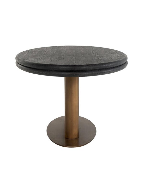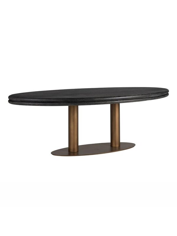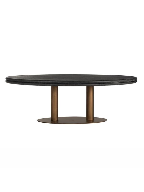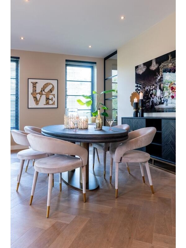 De Macaron serie van Richmond Interiors dankt zijn naam aan het speelse ontwerp: de dubbele rand van de eettafel doet denken aan het bekende Franse koekje. Het donkerbruine eikenhouten blad contrasteert prachtig met het goudkleurige onderstel en geeft de tafel een chique, moderne uitstraling.Deze elegante eettafel is een echte eyecatcher en past perfect in een stijlvol interieur. De serie bestaat daarnaast uit een ronde tafel, bijzettafel, salontafel en sidetable stuk voor stuk met dezelfde luxe uitstraling en perfect met elkaar te combineren