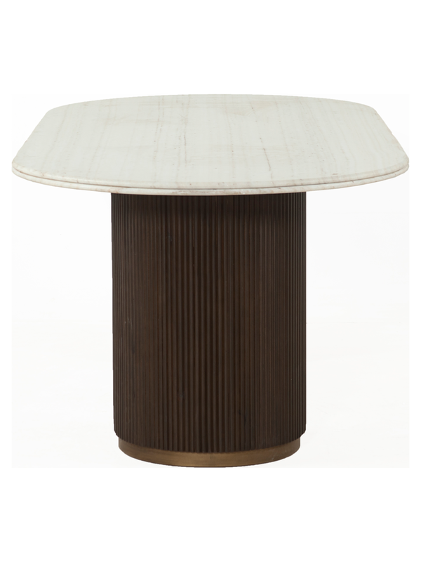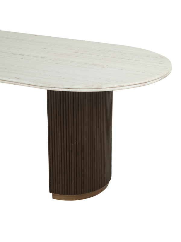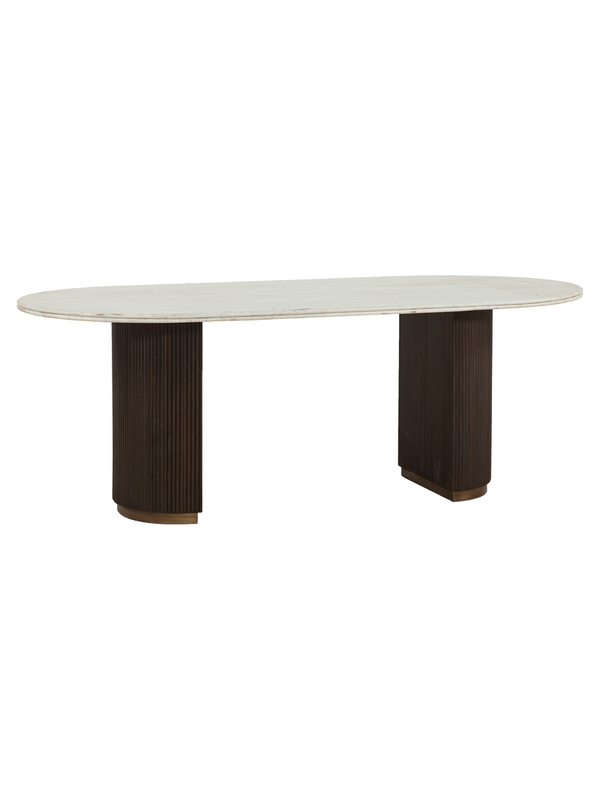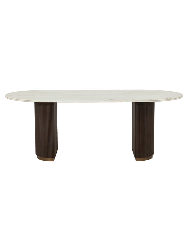 Breng luxe en karakter in huis met de Mayfield eettafel van Richmond. Het elegante marmeren blad en het warmgekleurde onderstel zorgen samen voor een stijlvolle eyecatcher in je eetkamer. Of je nu gaat voor een royale rechthoekige tafel of de charmante ronde variant, de Mayfield voegt altijd een vleugje klasse toe. Perfect te combineren met andere items uit de Mayfield-serie voor een mooi geheel.