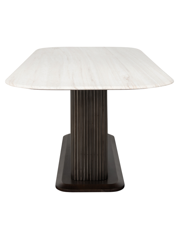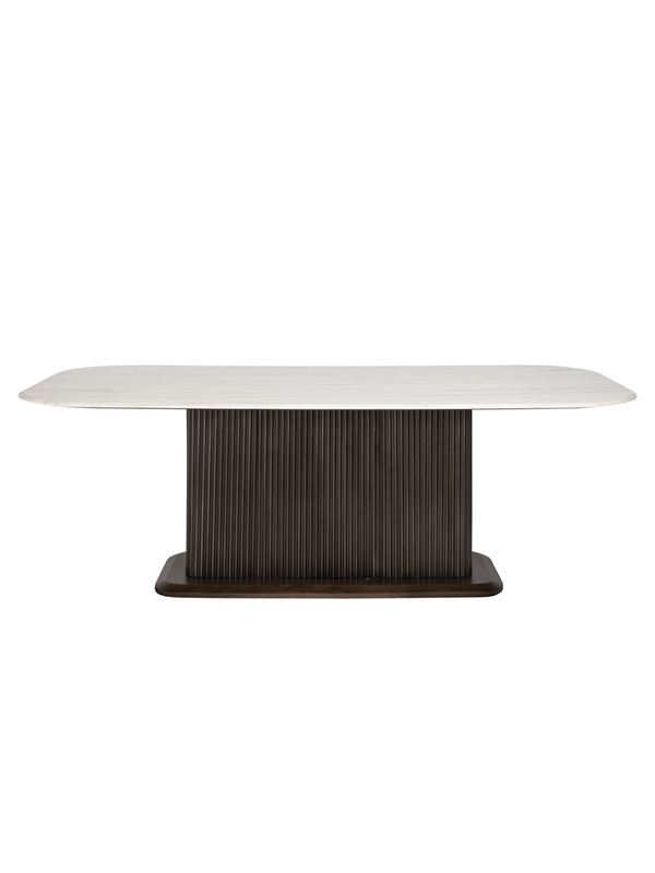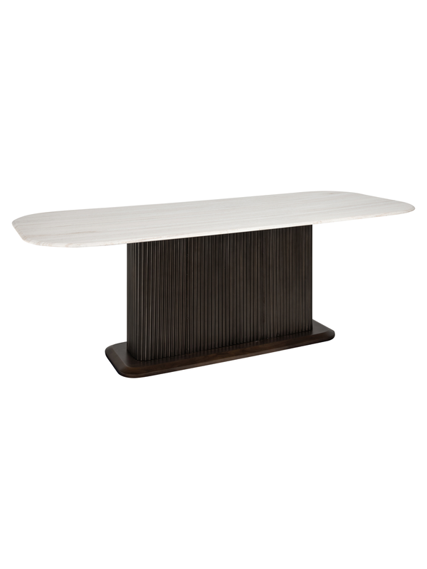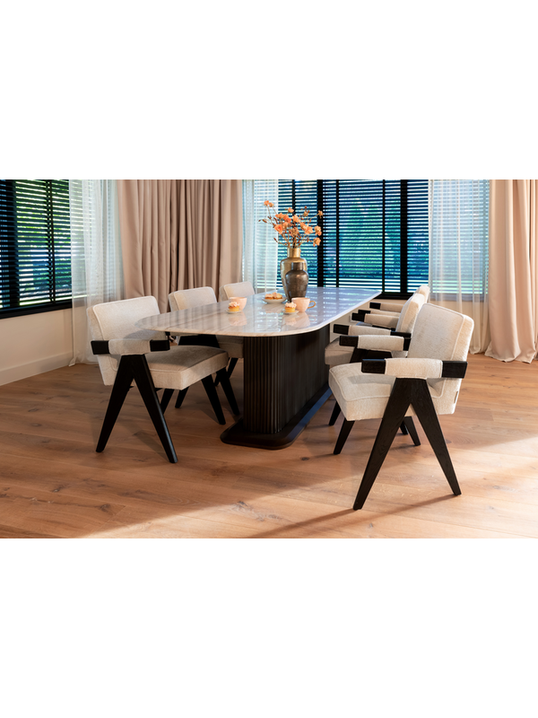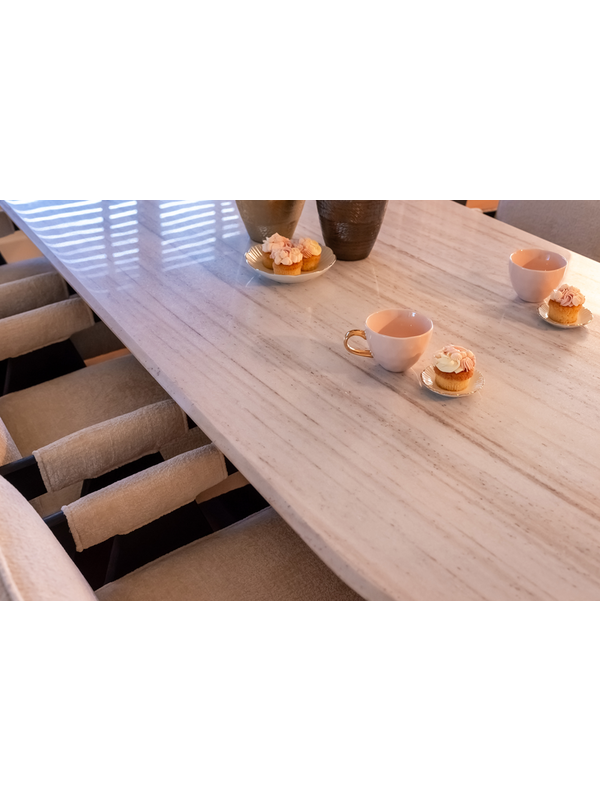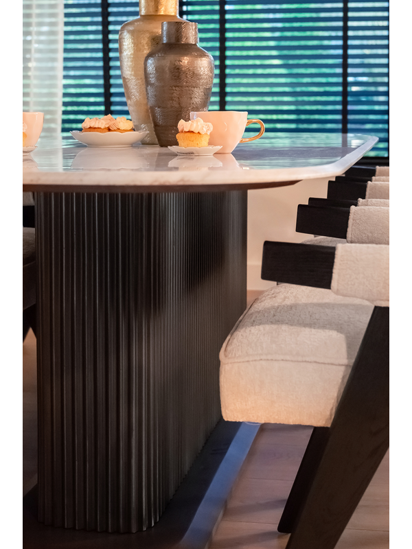 Op zoek naar een eettafel die een statement maakt? De Richmond Interiors Mayfield Wit Marmer Eettafel Ovaal van 230 cm is dan precies wat je nodig hebt. Deze tafel is een perfecte mix van elegantie en robuustheid, met een prachtig marmeren blad en een stevige mangohouten poot met latten.Het marmeren blad geeft deze tafel een luxe en verfijnde uitstraling. Of je nu een formele dinerparty organiseert of een gezellige familiebrunch, deze tafel zal ongetwijfeld de aandacht trekken. Het witte marmer is tijdloos en past naadloos in zowel moderne als klassieke interieurs.De stevige constructie van massief mangohout zorgt niet alleen voor stabiliteit, maar voegt ook een warm, natuurlijk element toe aan het design. Het contrast tussen het koele marmer en het warme hout zorgt voor een intrigerend visueel effect.Met een lengte van 230 cm biedt deze ovale eettafel genoeg ruimte voor grote gezelschappen. Combineer de tafel met andere meubels uit de Mayfield-collectie om een stijlvolle en samenhangend geheel te creëren.