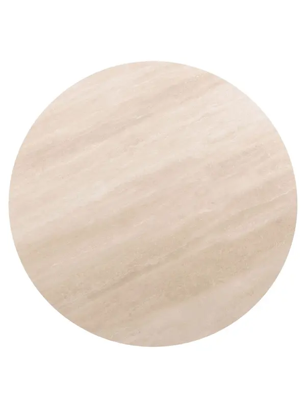 Het tafelblad is gemaakt van travertin, wat een warme en natuurlijke uitstraling geeft. Het onderstel van eiken fineer biedt een stevige basis en brengt extra warmte in de eetruimte. Dankzij het compacte formaat past de tafel goed in kleinere eetkamers en is hij ideaal voor ontspannen en sfeervol tafelen.