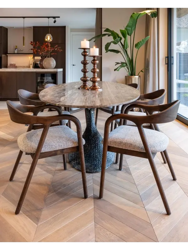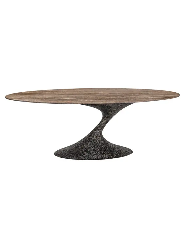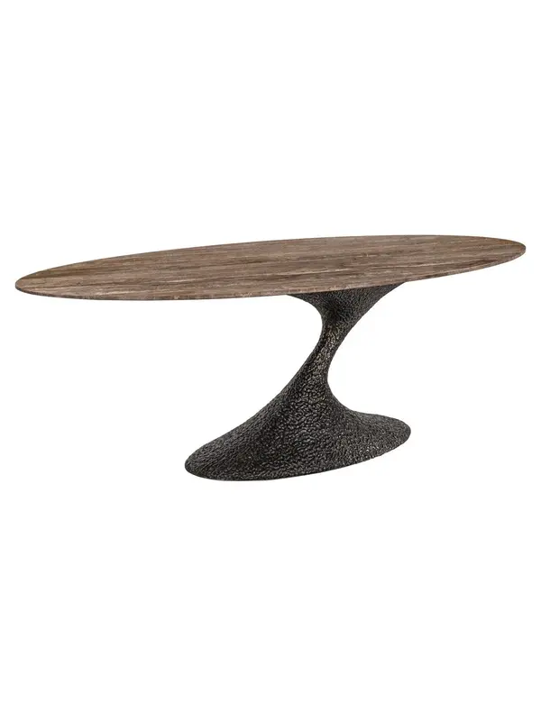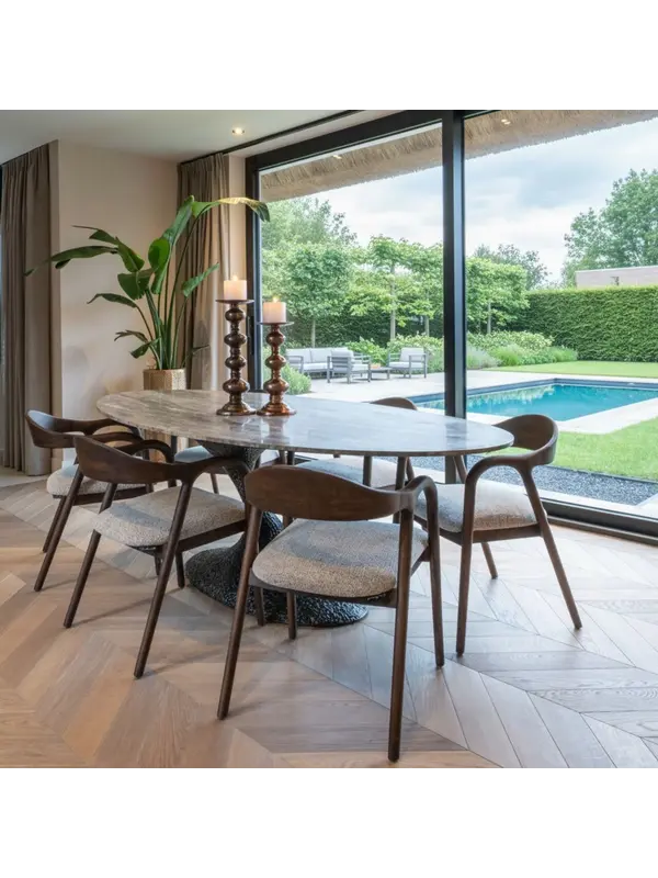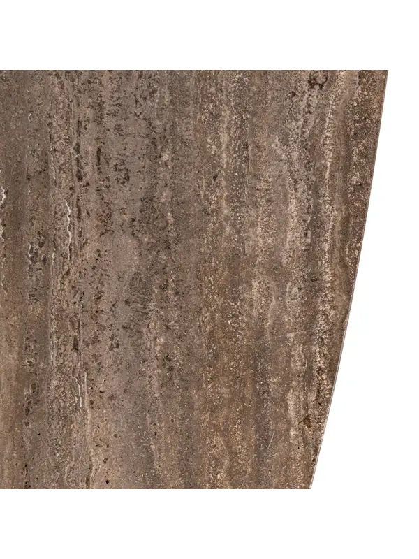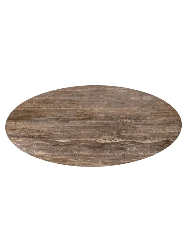 Deze unieke eettafel is een echte eyecatcher dankzij de bijzondere materiaalcombinatie en het sculpturale design. Het ovale blad is vervaardigd uit travertin, een natuursteen met een warme, natuurlijke uitstraling en unieke adering. De subtiele kleurschakeringen geven iedere tafel een eigen karakter en zorgen voor een tijdloze, luxe uitstraling.