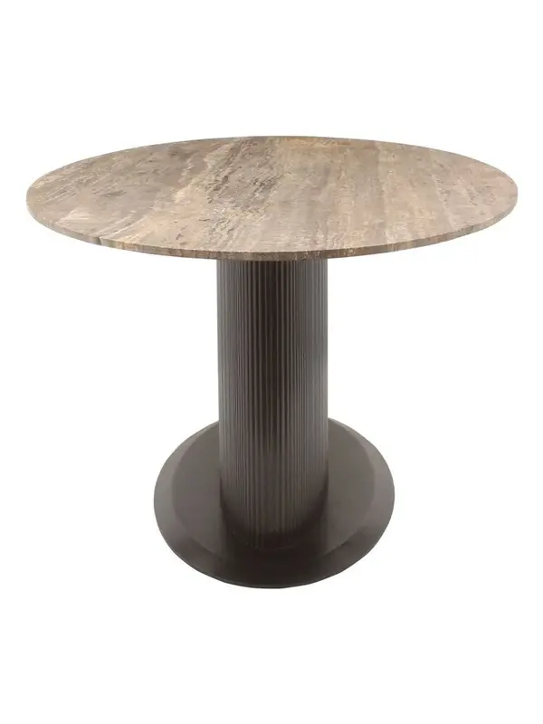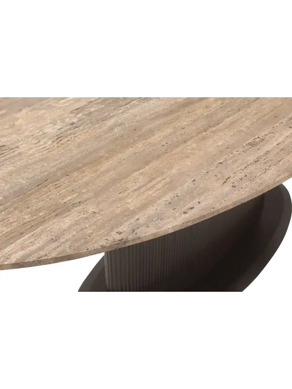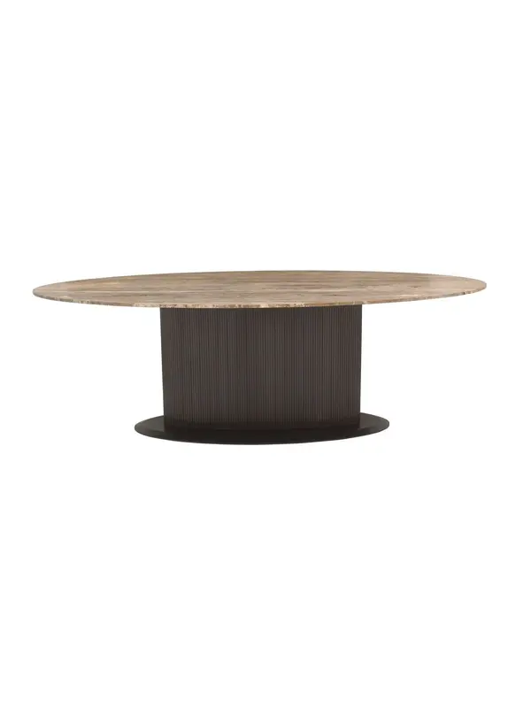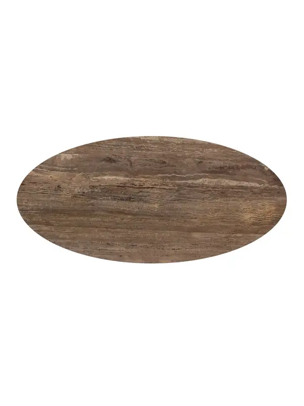 Deze elegante eettafel is een perfecte balans tussen natuurlijke materialen en modern design. Het royale, ovale blad is vervaardigd uit travertin en kenmerkt zich door warme kleurnuances en een unieke, natuurlijke tekening. Iedere tafel heeft hierdoor een eigen karakter en straalt pure luxe uit.