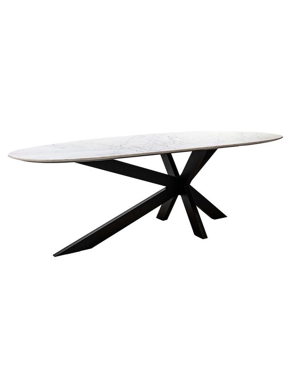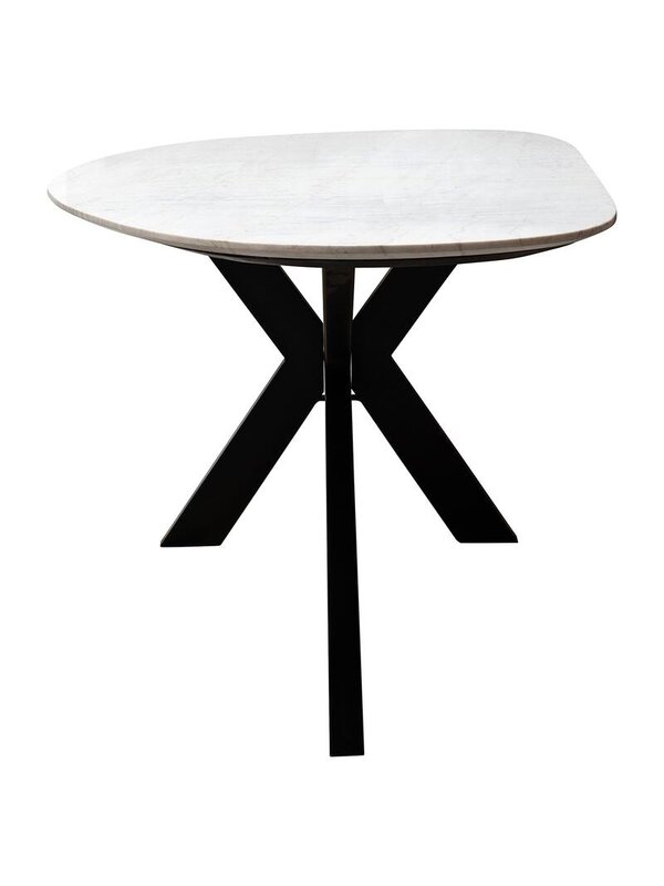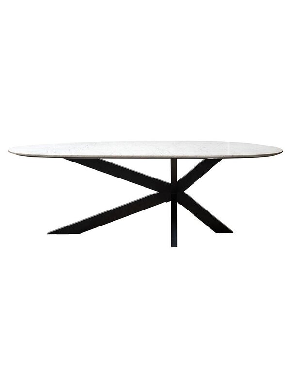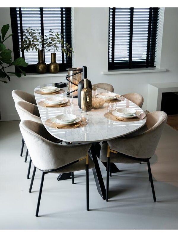 De Trocadero eettafel van Richmond trekt direct de aandacht met haar organisch gevormde marmeren blad en opvallende zwarte spinpoot. Het contrast tussen het zachte wit en het krachtige onderstel zorgt voor een stijlvolle balans van elegantie en modern design. Een tafel die je eetruimte moeiteloos naar een hoger niveau tilt, iedere dag opnieuw.