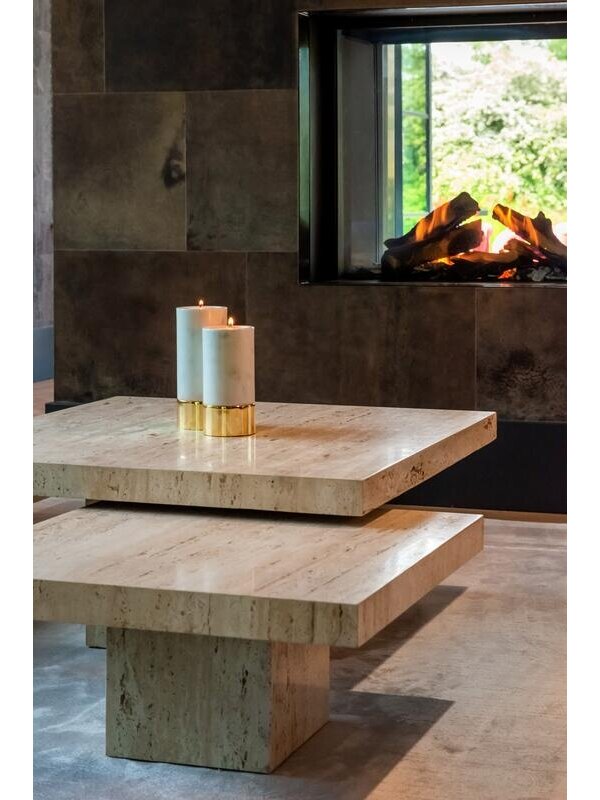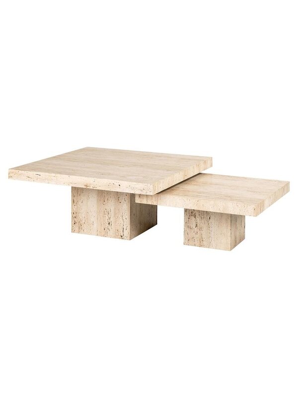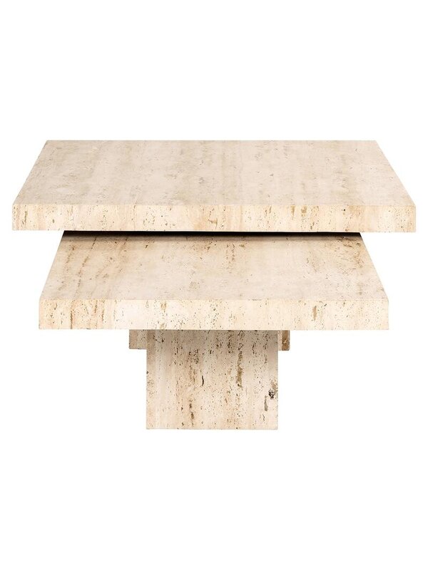 De La Cantera salontafelset van Richmond straalt verfijning uit in eenvoud. De vierkante vormen, volledig uitgevoerd in travertin, zorgen voor een krachtige en elegante uitstraling. De centrale voet geeft de tafels een stevig, sculpturaal karakter. Samen vormen ze een stijlvol duo dat warmte en balans brengt in je zithoek, perfect om je interieur een tijdloze touch te geven.