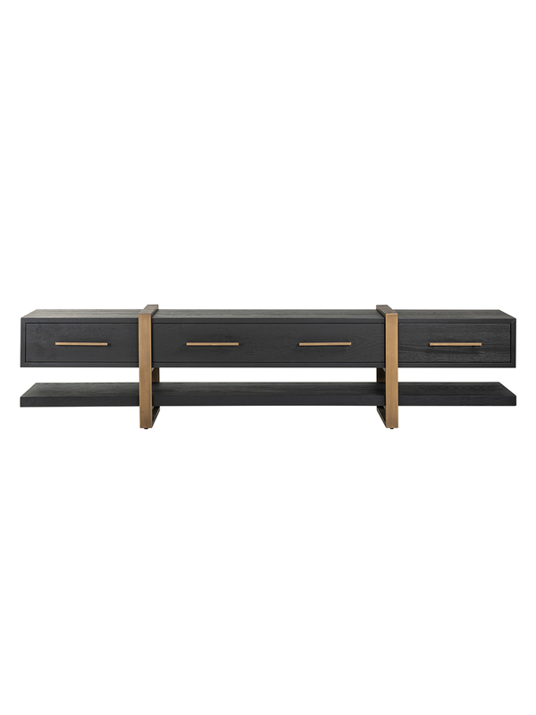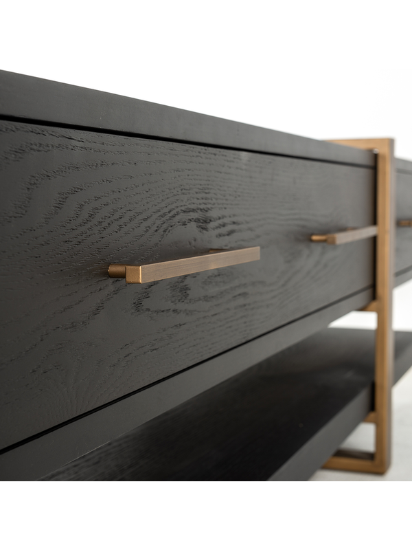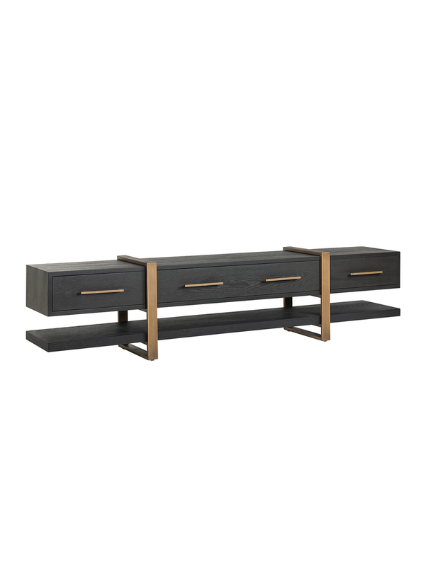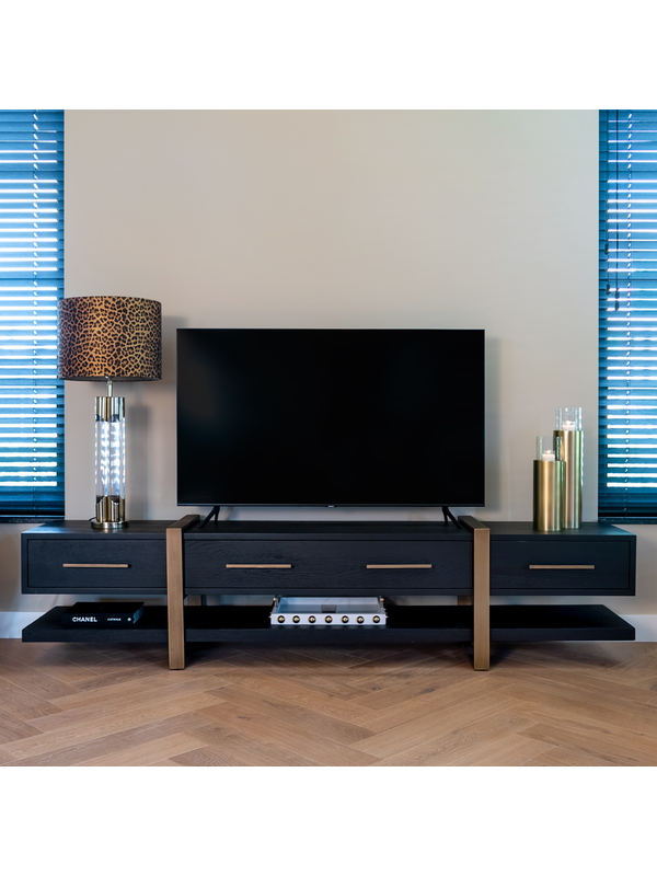 Geef je woonkamer een vleugje luxe met het Richmond Tv-Dressoir Cambon 3-Laden Dark Coffee. Met zijn chique uitstraling en elegante donkere tint is dit meubelstuk een stijlvolle blikvanger in elk interieur. De strakke vormgeving en praktische indeling maken het ideaal om je media-apparatuur en accessoires netjes op te bergen, terwijl het meteen een warme en verfijnde sfeer in de ruimte brengt.