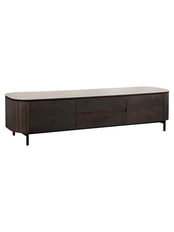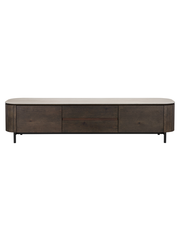TV-meubel Ritz van het merk Richmond Interiors is een stijlvolle basis voor je woonkamer. Het donkere eikenfineer in combinatie met het faux travertin blad geeft dit meubel een chique en moderne uitstraling. Dankzij de praktische indeling met deuren en lades berg je de apparatuur netjes uit het zicht op. Combineer het TV-meubel met de andere meubels uit de Ritz collectie voor een harmonieus geheel.