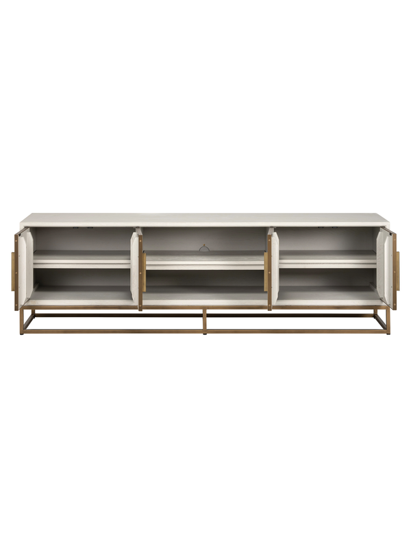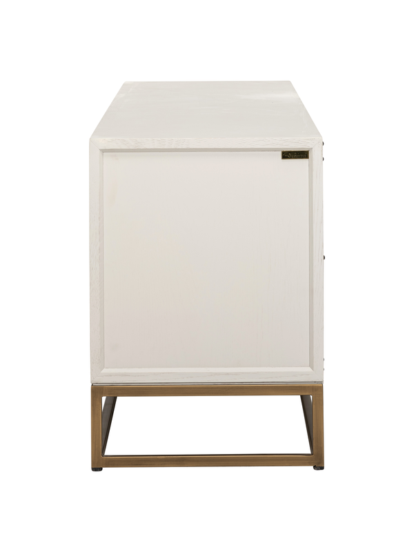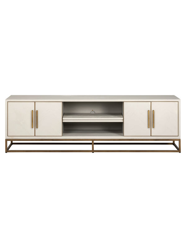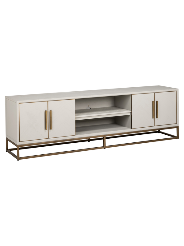 Het tv-meubel uit de Whitebone Brass-collectie combineert verfijnd eikenfineer met koperkleurige details voor een elegante uitstraling. Achter de vier deuren vind je volop ruimte om je apparatuur en accessoires netjes op te bergen. Een eyecatcher van 200 cm breed die design en functionaliteit moeiteloos samenbrengt.