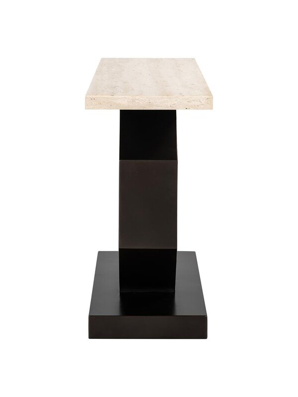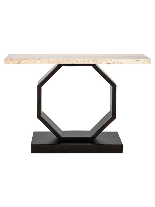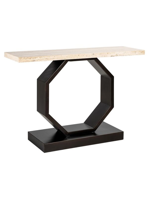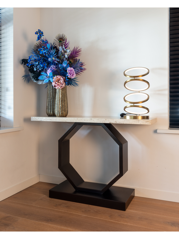 Breng een verfijnde mix van klassieke elegantie en modern design in huis met de Richmond Wandtafel Avalon. Het luxe travertin blad straalt tijdloze klasse uit en past moeiteloos in verschillende interieurstijlen. De opvallende hexagonale poot van bronskleurig metaal geeft de tafel een eigentijdse touch en maakt van de Avalon een echte blikvanger.Of je de tafel nu plaatst in de woonkamer, hal of eetkamer, hij biedt niet alleen een stijlvol oppervlak voor decoratieve items, maar ook een subtiel statement van design en kwaliteit. De combinatie van hoogwaardige materialen en een uniek ontwerp maakt deze wandtafel tot een duurzame en elegante toevoeging aan je interieur.