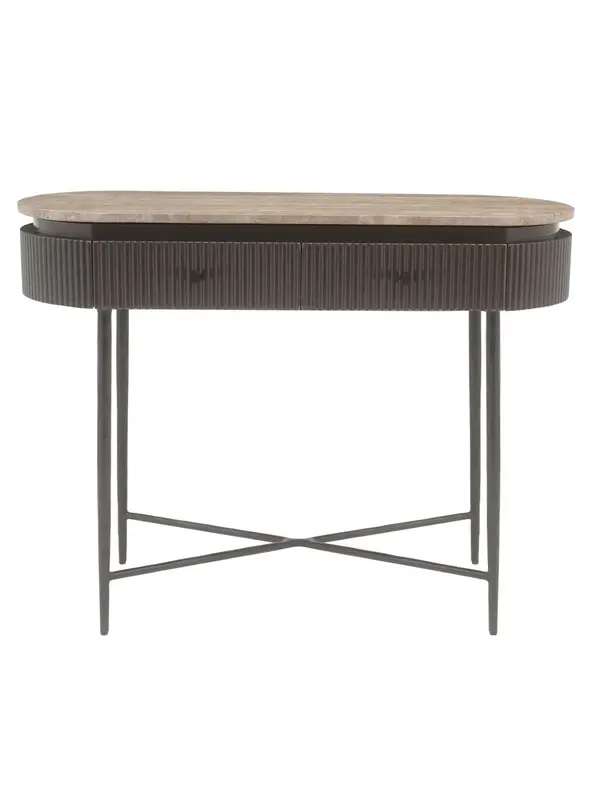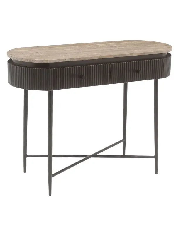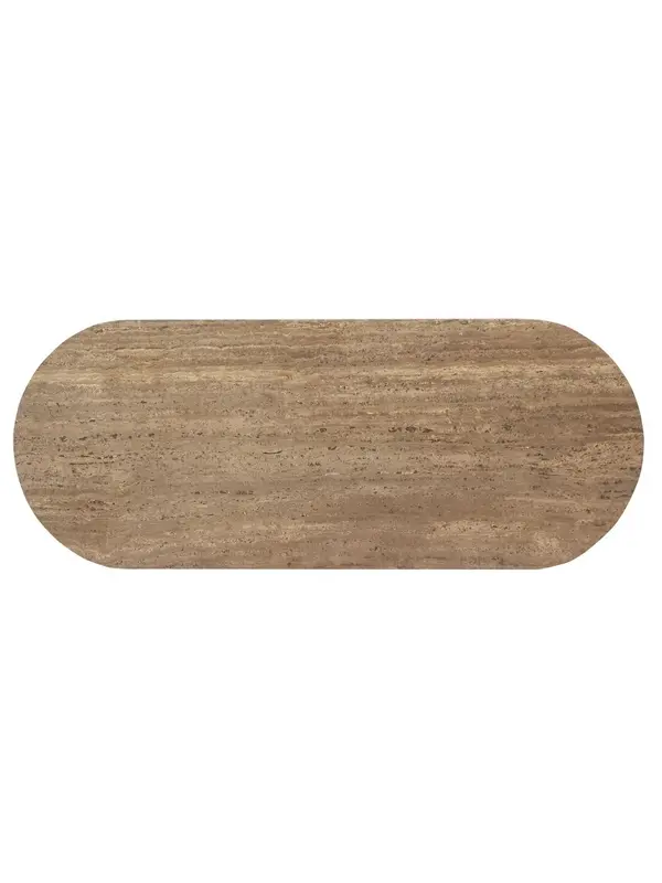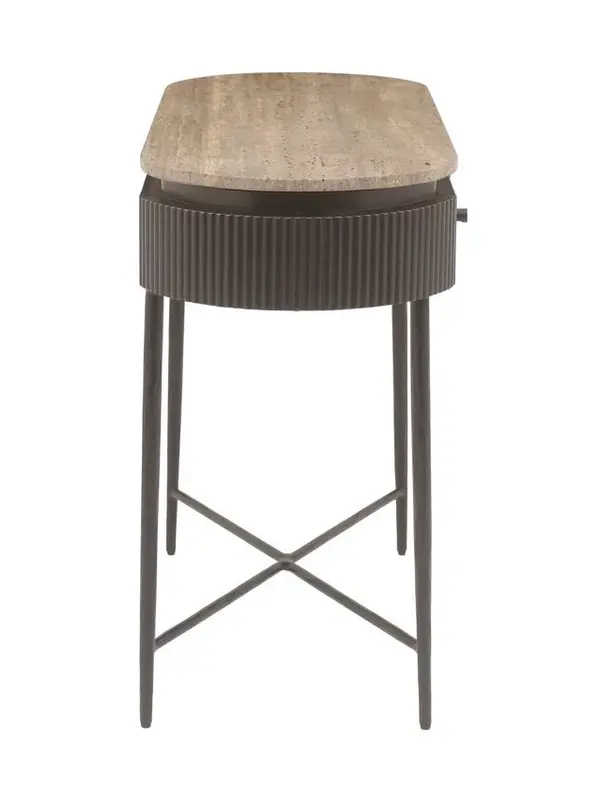 Deze elegante sidetable straalt luxe en verfijning uit door de combinatie van hoogwaardige materialen. Het blad is vervaardigd uit travertin, een natuursteen met een warme, natuurlijke tekening die iedere tafel uniek maakt. De subtiele kleurnuances geven het meubel een tijdloze en exclusieve uitstraling.
