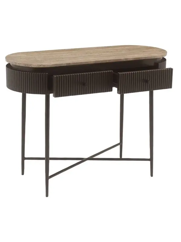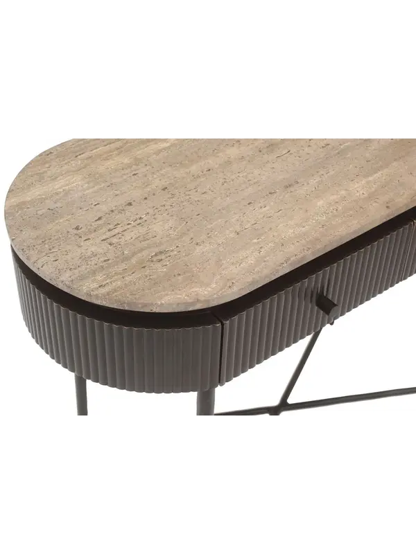 De houten laatjes voegen niet alleen functionaliteit toe, maar zorgen ook voor een warm contrast met het travertin blad. Ideaal voor het opbergen van kleine accessoires. Het slanke metalen onderstel geeft de tafel een moderne touch en zorgt voor een luchtig geheel.